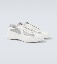 The Prada America's Cup sneakers are built with panels of glossy patent leather and technical fabric inserts. The sleek pair boasts the brand's unmistakable Linea Rossa label on the tongues. Product Details - Upper: calf leather, fabric - Lining: fabric - Sole: leather insole, rubber sole - Toe shape: round toe - Made in Italy - Includes: shoe box, dust bag - Designer color name: White - Item color: white, silver - Closure: lace-up - Item number: P01126040 Size & Fit - True to size - Half sizes please take the next size up - UK sizes