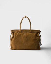 This pragmatic and sophisticated tote is made of suede embellished with elegant straps. The roomy style blends different references in a design with a sleek but distinctive aesthetic, embellished with the iconic enameled metal triangle logo. - Product code: 2VG128_2C4S_F0401_V_OOO - Decorative straps with buckles - Leather handles - Detachable, adjustable leather shoulder strap with buckle. Maximum length 130 cm - Minimum length 110 cm - Maximum drop 62 cm - Minimum drop 52 cm - Enameled metal triangle logo on the front - Zipper closure - Interior with zipper pocket - Logo-print Re-Nylon and nappa leather lining - Imported Height: 36cm Width: 50cm Length: 17cm MATERIALS Main material: Calfskin