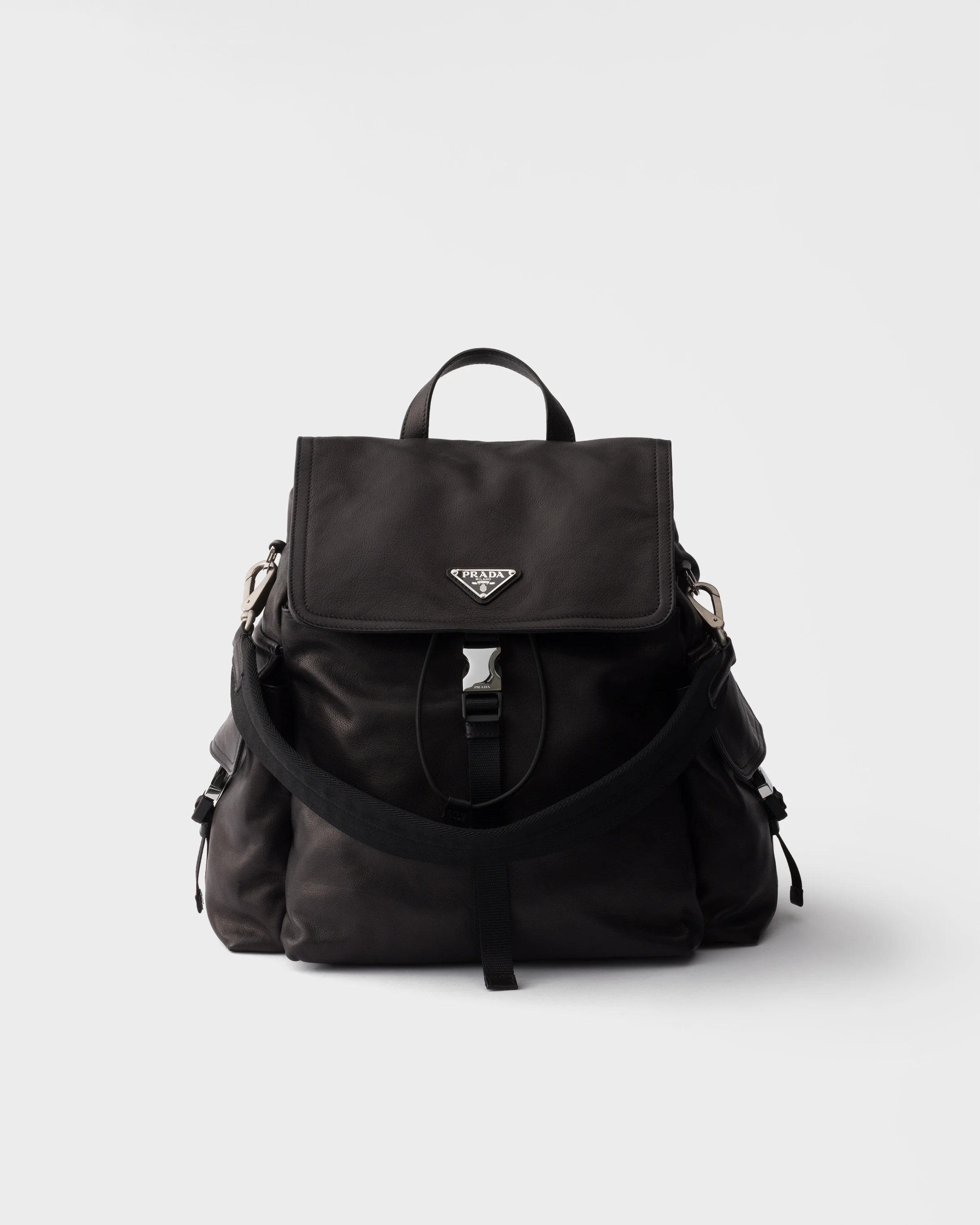 The Explore backpack features a soft, multi-pocket silhouette, an expression of a sporty-chic style. The spacious and versatile design is made of leather with refined details and iconic notes that reflect Prada's artisan tradition. - Product code: 2VZ118_2HE8_F0002_V_OOO - With removable padded Re-Nylon handle - Leather handle - Adjustable Re-Nylon harness straps - Enameled metal triangle logo on the flap - Closure with drawstring, flap and side-release buckle - Three external zipper pockets with flap and side-release buckles - Back pocket with magnet - Interior with zipper pocket and patch pocket - Logo-print Re-Nylon lining - Imported Height: 37cm Width: 38cm Length: 19.5cm MATERIALS Main material: Buffalo