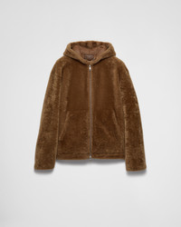 This shearling jacket reinterprets a classic sporty silhouette with soft lines and contemporary style details. - Product code: UPW512_15PX_F0050_S_OOO - Unlined - Regular fit - Center zipper closure - Hooded collar - Straight sleeve - Patch pockets - Hem with elasticized drawstring - Leather triangle logo on the back - Imported - The model is 188 cm tall and wears a size 48 Height: 72cm MATERIALS Main material: Lambskin