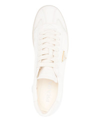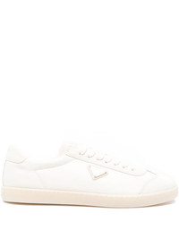 triangle-logo sneakers Highlights - White - Leather - Enamel triangle logo - Lace-up fastening - Round toe - Flat rubber sole Composition Outer: Leather 100%, Polyamide 100% Lining: Calf Leather 100% Sole: Rubber 100%