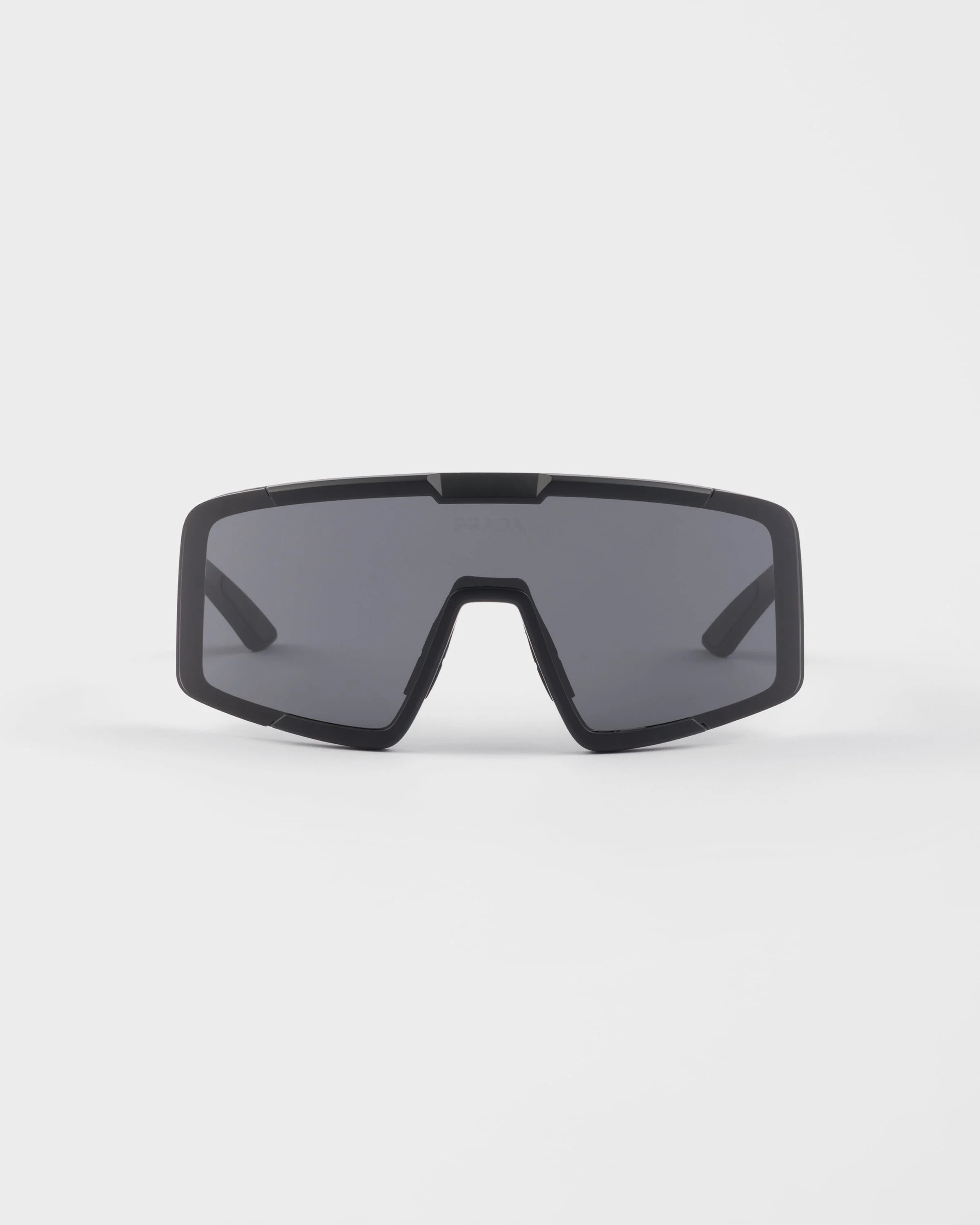 Sunglasses featuring a large mask front that recalls the aesthetic of ski goggles, combining high performance with a contemporary attitude. The bold temples are defined by the rubberized detail of the Prada Linea Rossa logo. - Product code: SPSB07_E1BO_FE06F_C_044 - Nylon frame front - Color: Opaque Black - Frame not compatible with graduated lenses - 100% UVA / UVB protection - Standard fit - Lens-nose-temple measurements: 144-125 mm - Article comes with dedicated packaging - Other colors available - Imported MATERIALS Acetate