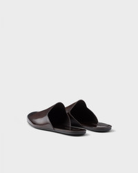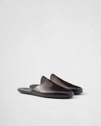 Brushed leather, an emblematic material of Prada collections, gives these minimalist slippers sophisticated allure. The tapered silhouette, characterized by thin rubber soles, is completed with insoles for greater comfort. The screen-printed lettering logo on the upper enhances the sleek and contemporary elegance of the footwear. - Product code: 2S2986_X6O_F0038_F_G012 - Screen-printed lettering logo on the upper - Light rubber sole, 5 mm - Brushed leather insole - Imported MATERIALS Main material: Calfskin