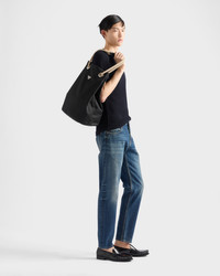 Original combinations animate this Re-Nylon bag inspired by the timeless codes of nautical style. The soft, roomy silhouette is characterized by sliding handles made of cord and leather, in contrast with the functional texture of Re-Nylon. For sustainable care to preserve the product's characteristics and reduce microfiber shedding, we recommend not washing the item too often. Let the product air out after every use and have it dry cleaned at a specialized ecological dry cleaners. - Product code: 2VG133_2HG8_F0002_V_OOO - Sliding cord and skin handles - Enameled metal triangle logo on the front - Interior with zipper pocket - Logo-print Re-Nylon lining - Imported Height: 44cm Width: 34cm Length: 24cm MATERIALS Main material: Recycled polyamide