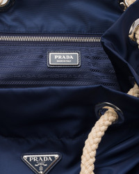 Original combinations animate this Re-Nylon bag inspired by the timeless codes of nautical style. The soft, roomy silhouette is characterized by sliding handles made of cord and leather, in contrast with the functional texture of Re-Nylon. For sustainable care to preserve the product's characteristics and reduce microfiber shedding, we recommend not washing the item too often. Let the product air out after every use and have it dry cleaned at a specialized ecological dry cleaners. - Product code: 2VG133_2HG8_F0216_V_OOO - Sliding cord and skin handles - Enameled metal triangle logo on the front - Interior with zipper pocket - Logo-print Re-Nylon lining - Imported Height: 44cm Width: 34cm Length: 24cm MATERIALS Main material: Recycled polyamide