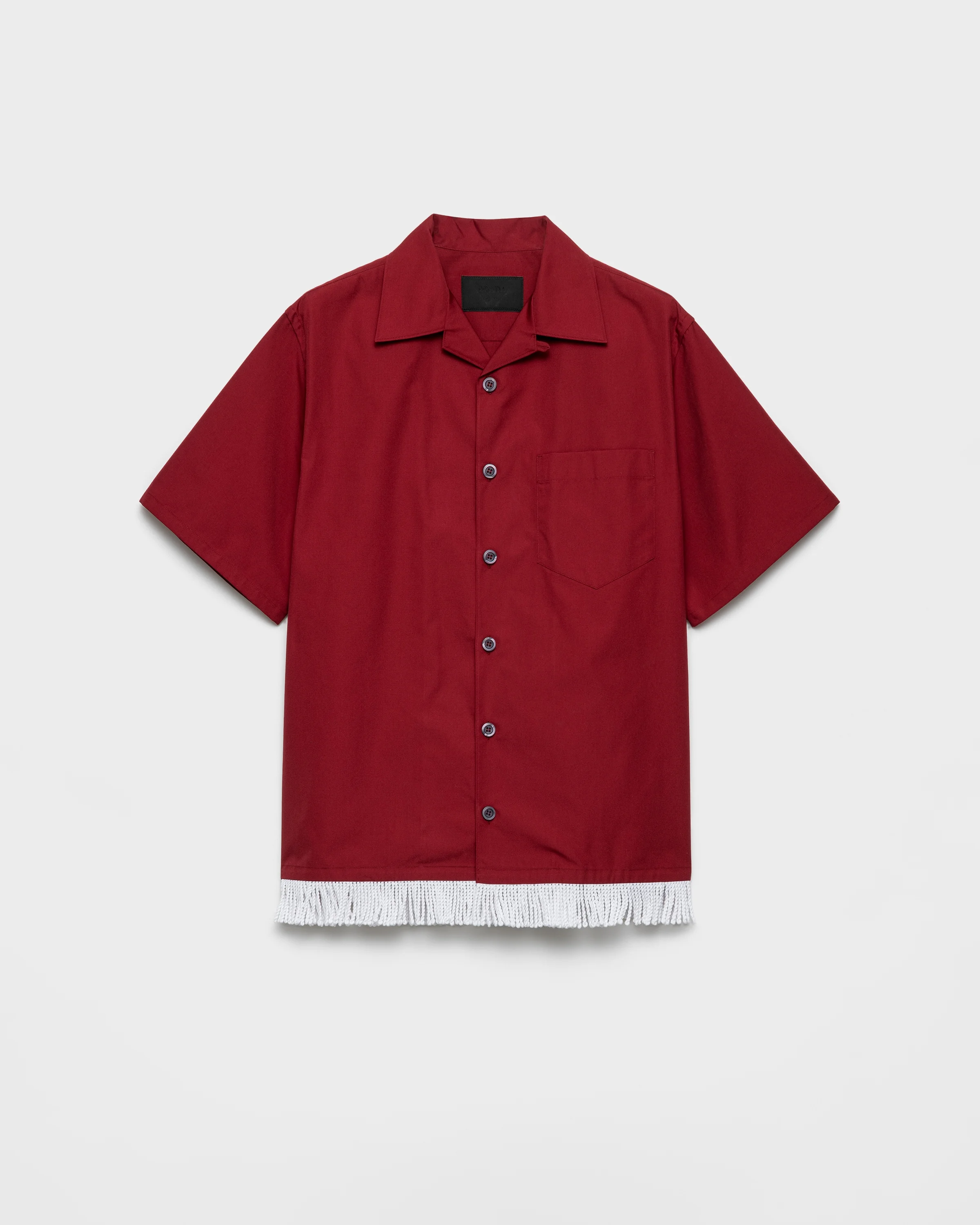 A change of tone redefines classics from the Prada wardrobe like the bowling shirt presented with original, retro-inspired details. The lighthearted freedom of the season is translated into a lightweight, boxy silhouette with fringe on the hem. - Product code: UCS547_18T2_F0041_S_OOO - Straight fit - Bowling collar - Classic breast pocket - Straight hem - Mother-of-pearl button closure - Fabric triangle logo on the back - Decorative fringe on the hem - Imported - The model is 188 cm tall and wears a size 48 Height: 69cm MATERIALS Main material: 35% Cotton, 65% Polyester
