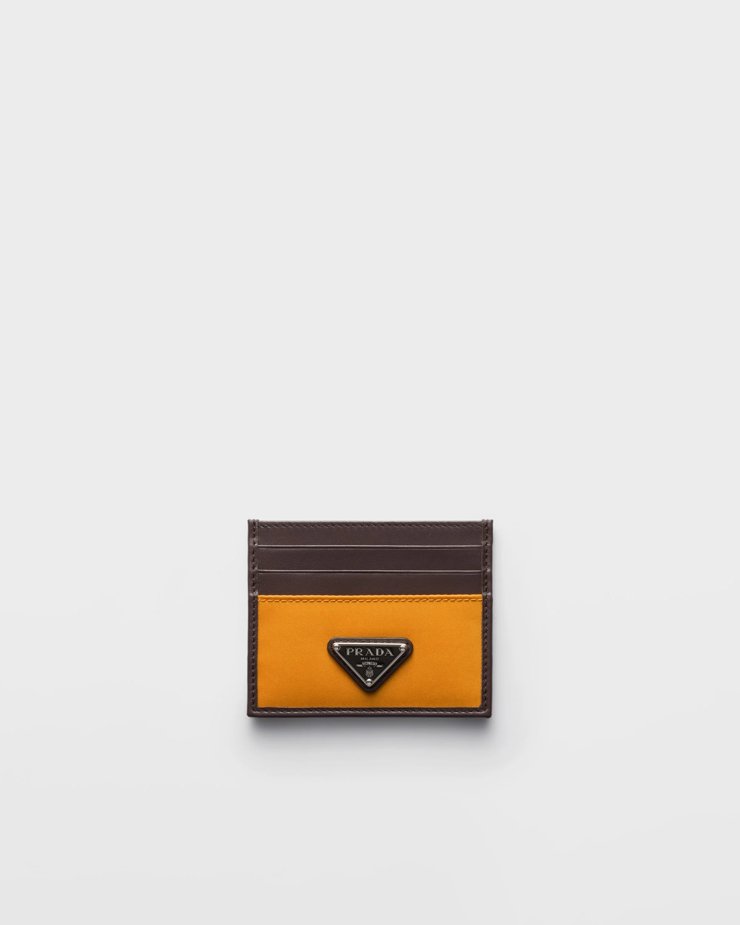 This card holder with a contemporary design made of leather and Re-Nylon balances elegance and functionality. The sleek and compact accessory is decorated with the enameled metal triangle logo. - Product code: 2MC025_2DW3_F0287 - Enameled metal triangle logo - Six card slots - Internal pocket - Moire and leather lining - Imported Height: 8cm Width: 10cm MATERIALS Main material: Recycled polyamide