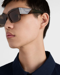 Acetate sunglasses with a contemporary, square design. The large front with bold rims is paired with faceted temples enhanced by the distinctive three-dimensional workmanship decorated with the Prada lettering logo. Several color variations feature a combination of acetate layers highlighted by contrasting colors on the rims. - Product code: SPRB17_E29E_FE90F_C_054 - Recycled bio-acetate frame front - Color: Transparent Bark Brown - Frame compatible with graduated lenses - 100% UVA / UVB protection - Standard Fit - Lens-nose-temple measurement: 54-20-145 mm - Article comes with dedicated packaging - Other colors available - Imported MATERIALS Main material: Acetate