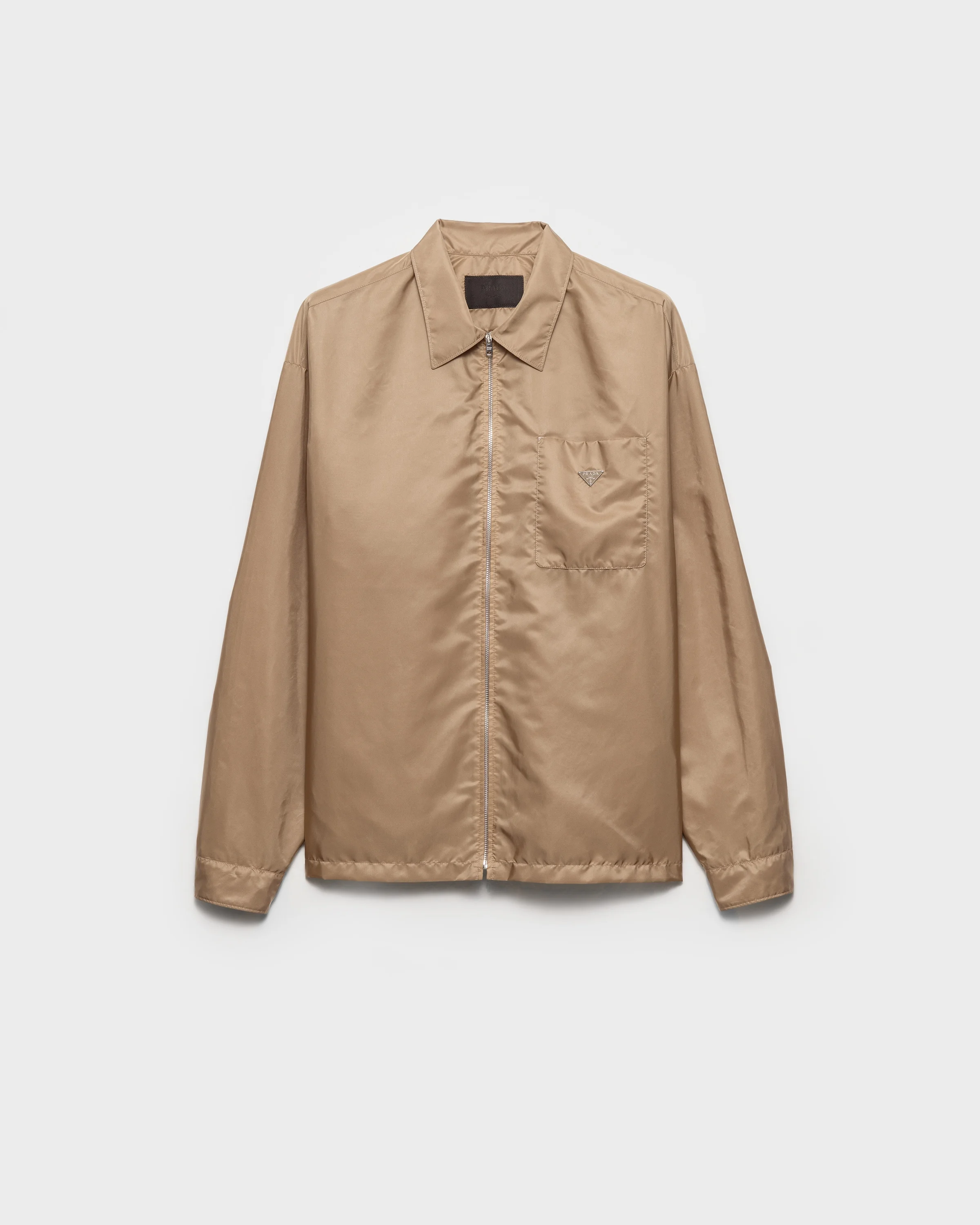 Sleek lines define the silhouette of this Re-Nylon shirt with sporty details, decorated with the enameled metal triangle logo. For sustainable care to preserve the product's characteristics and reduce microfiber shedding, we recommend not washing the item too often. Let the product air out after every use and follow the washing instructions on the label. - Product code: SC847_1WQ9_F034X_S_OOO - Loose fit - Classic collar - Patch pocket - Straight hem - Cuff with mother-of-pearl button - Zipper closure - Enameled metal triangle logo - Imported - The model is 188 cm tall and wears a size 48 Height: 70cm MATERIALS Main material: 100% Recycled Polyamide