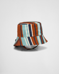 Prada presents a reinterpretation of the classic bucket hat: the longer brim at the back creates a triangular shape that covers the nape and recalls both Prada's iconic geometric logo and classic rain hats. The adjustable chin strap adds a retro note, while the side slots for inserting eyewear temples and a three-dimensional pouch on the back reveal the versatile and contemporary soul of this accessory. The Bayadere print that recalls summers of yesteryear enhances the design and adds a lively note. - Product code: 2HC282_2DZA_F0046 - «Bayadere» print - With a mini pouch - Enameled metal triangle logo - Cotton lining MATERIALS Fabric
