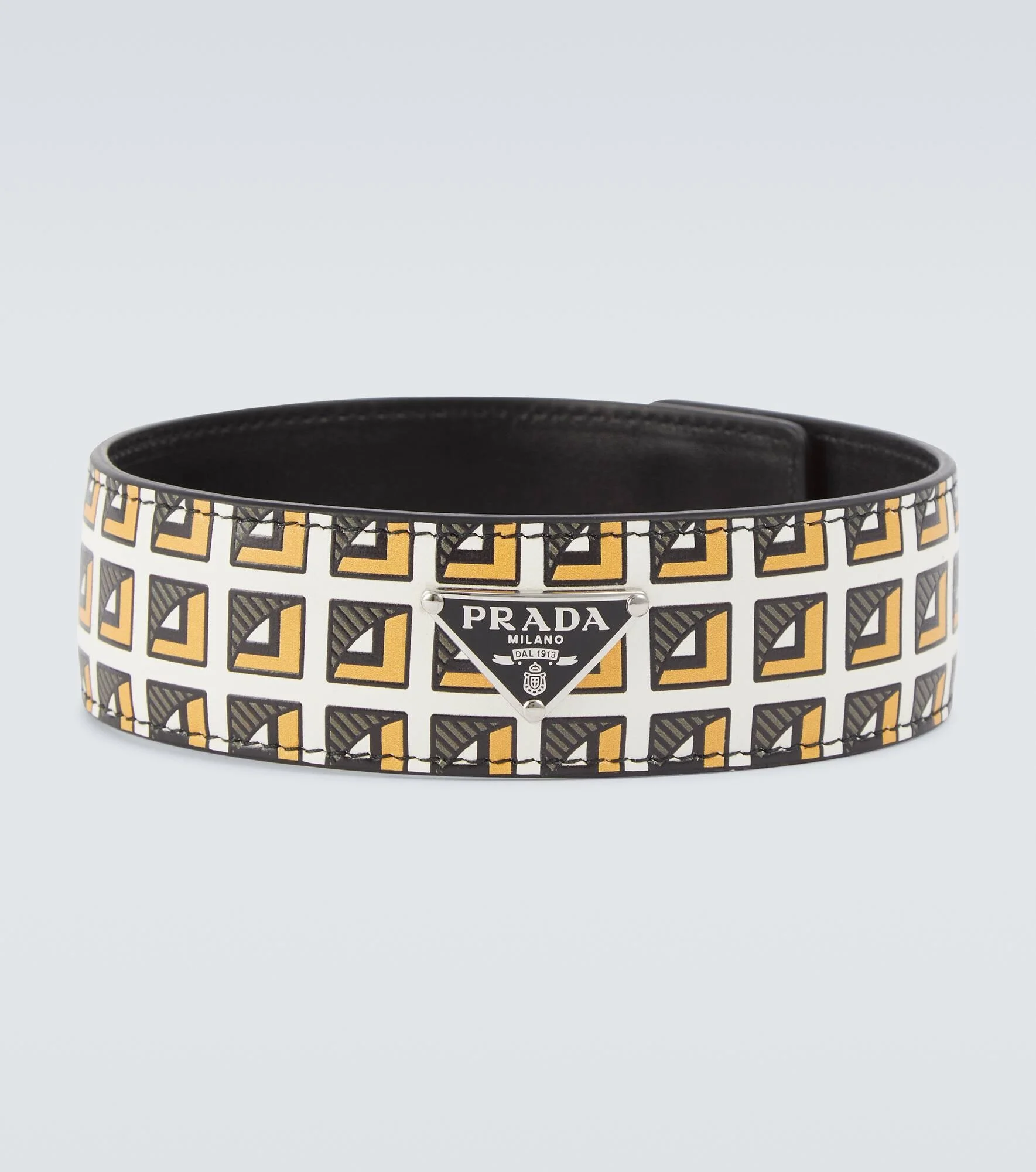 A retro-inspired geometric motif entirely covers this choker from Prada, made from supple leather and detailed with the brand's signature enameled metal triangle logo. Product Details - Material: leather - Designer color name: Topazio - Closure: snap-buttoned fastenings - Item number: P00700277 Size & Fit - Adjustable length - Width 3,5cm-1.5" - Length of size S = 34/36cm-13.5/14" - Length of size M = 36/38cm-14/15" - Length of size L = 38/40cm-15/15.5"