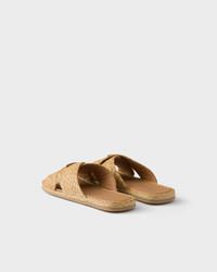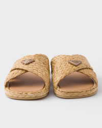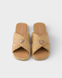 The sleek, contemporary silhouette of these sandals is enriched by the natural texture of raffia. Refined weaves created by hand enhance the clean lines of the design decorated with the enameled metal triangle logo. - Product code: 2X3142_027_F0018_F_G000 - Enameled metal triangle logo - Sole with rubber base - Heel height 15 mm - Leather-covered insole - Imported MATERIALS Main material: Raffia