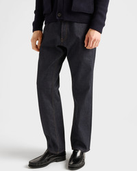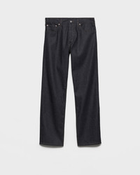 These raw denim jeans with a mid-rise waist and classic cut have a sleek, sophisticated design. The five-pocket style is embellished with a small leather strap on the back and label with archive logo. - Product code: GEP358_17YZ_F0008_S_AA2 - Raw denim treatment - Regular fit - Mid-rise waist - Hem width: 21 cm, Size: 32 - Button fly - Contrasting stitching - Total length 106 cm, size 32 - Leather strap with buckle on the back - Pressed garment - Prada Milano logo label on the back - Imported - The model is 188 cm tall and wears a size 48 Height: 106cm MATERIALS Main material: 100% cotton