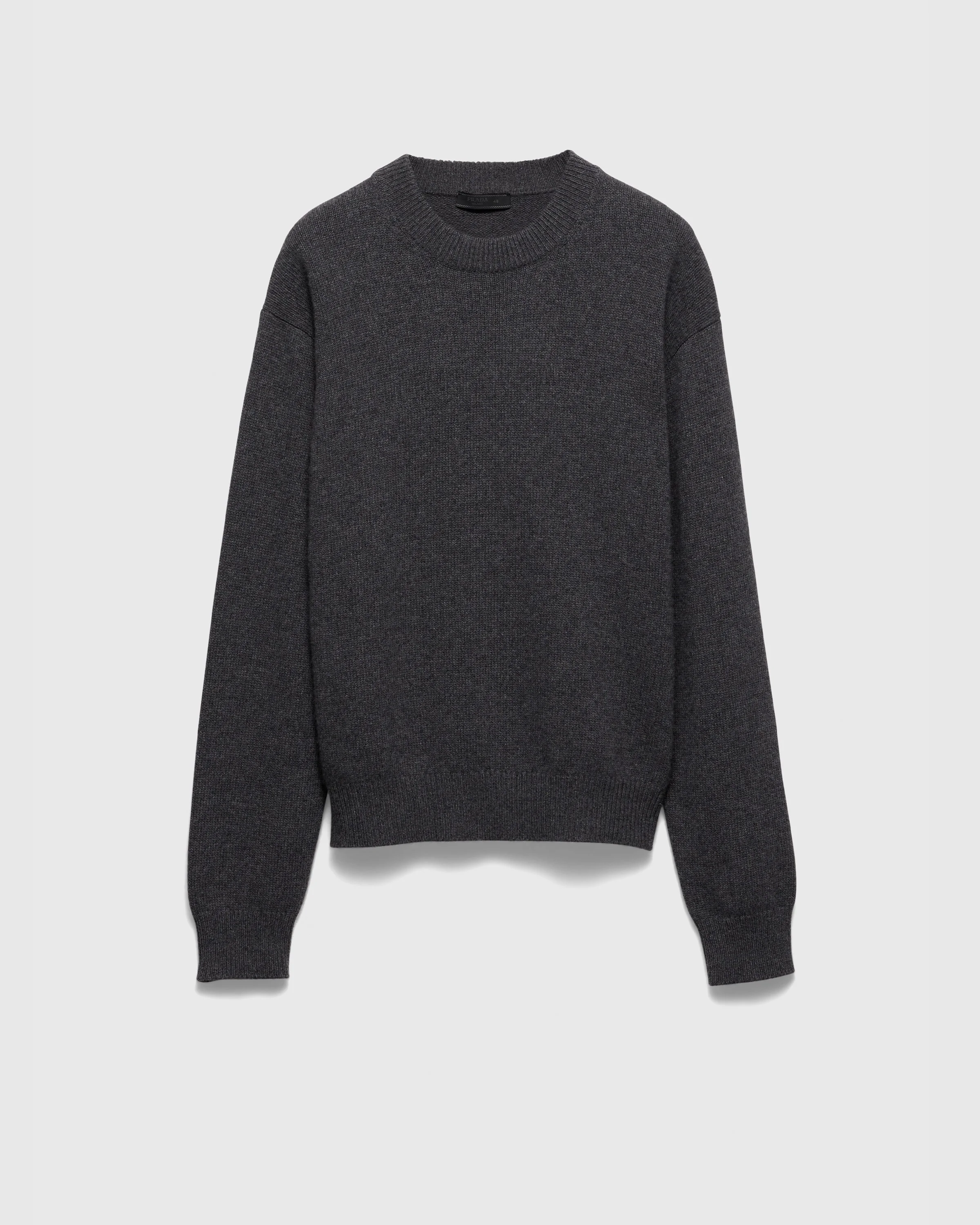 Classic lines and sleek details define this refined sweater made of soft regenerated cashmere with ribbed knit trim. The tonal triangle logo completes the refined and versatile style. - Product code: UMB674_16ZJ_F0480_S_232 - Plain knit - Regular fit - Ribbed knit crew neck - Semi-raglan shoulder - Ribbed knit cuffs and hem - Knit triangle logo - This garment is made with regenerated cashmere yarn - Imported - The model is 189 cm tall and wears a size 38 Height: 66cm MATERIALS Main material: 100% recycled cashmere