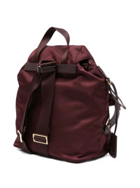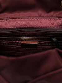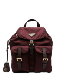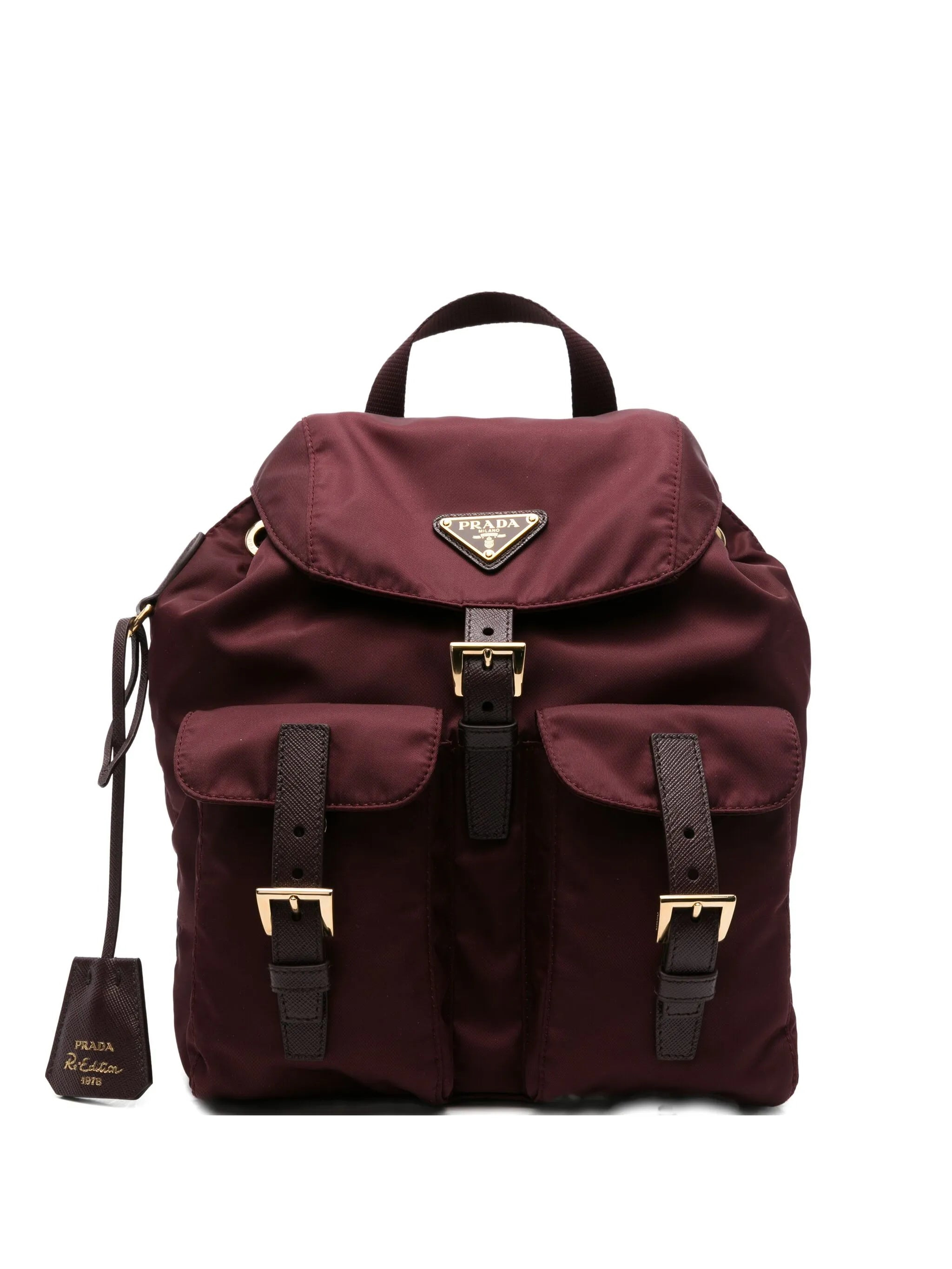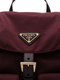 burgundy red Saffiano leather trim drawstring closure top handle buckle fastening straps triangle logo plaque - depth: 11.0 centimetres, height: 25.0 centimetres, width: 24.0 centimetres - Color: RED - Made in: Italy - Designer Style ID: 1BZ677 V OOM RV44 F0GCM Composition and care Outer Composition Recycled Nylon: 100.0%