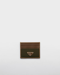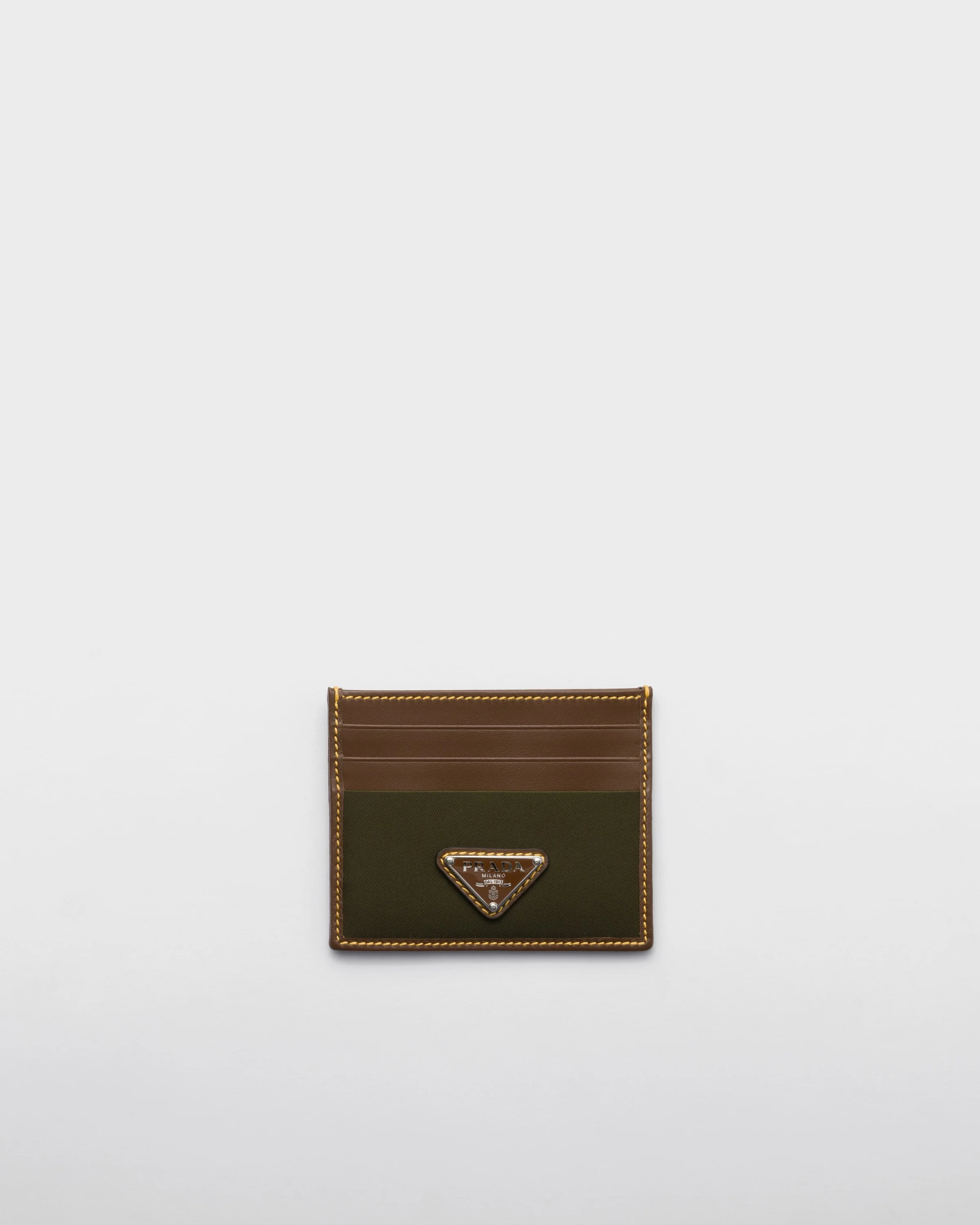 Sleek lines and iconic geometric shapes define this card holder made of leather and Re-Nylon, embellished with the enameled metal triangle logo. This product does not contribute to the SEA BEYOND educational program. - Product code: 2MC025_384_F041O - Enameled metal triangle logo - Six card slots - Internal pocket - Moire and leather lining - Imported Height: 8cm Width: 10cm MATERIALS Main material: Recycled polyamide