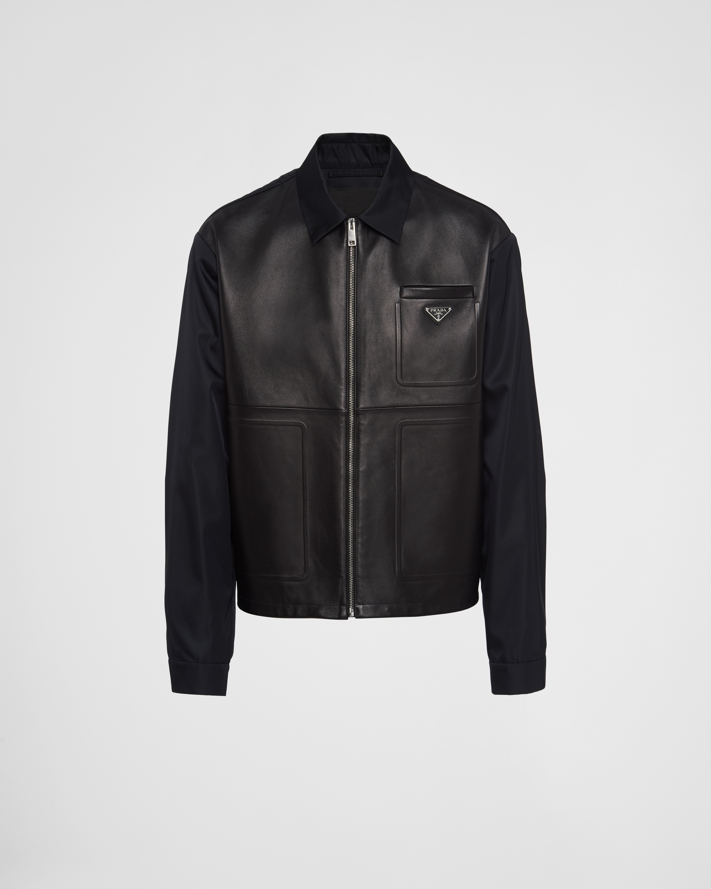 A classic design re-imagined through a contrast of textures. This minimalist jacket is made from innovative Re–Nylon and leather for an iridescent yet soft effect. This item, which reflects the brand’s hybrid allure, bears the signature enameled metal triangle logo. This product does not contribute to the SEA BEYOND educational program. - 商品品番: SGC182_1WQ8_F0002_S_231 - Leather front - Regular fit - Shirt collar - Straight sleeves - Zipper closure - Concealed side pockets - Buttoned cuffs - Wide shoulders - Straight hem - Unlined - Enameled metal triangle logo - インポート - The model is 188 cm tall and wears a size 48 高さ: 65cm MATERIALS Leather