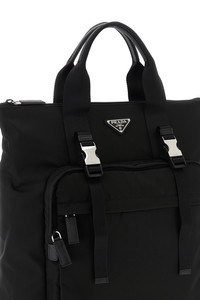 cod. 2VG098VOOM2DMGF0002 Re-Nylon and Saffiano backpack shopping bag, triangle logo in enamelled metal and front zip pockets, double fixed handle, top zip closure, adjustable and partly removable logo ribbon shoulder straps to be stored in the back pocket. Color: Black Size & Fit: W 39 x H 40 x D 11 cm Composition: 100% recycled polyamide Made in: Italy PROMO CODE NOT APPLICABLE