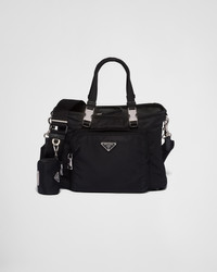 A travel accessory designed to carry your pet, this pet bag with shoulder strap and double handle is made of a combination of iconic materials of the brand: Saffiano leather and nylon, a fabric first introduced in the luxury world by Prada. Decorated with the iconic triangle logo, the equipped design has external pockets and essential pet care accessories inside like a strap for the collar, food bowl and pet waste bag holder. For sustainable care to preserve the product's characteristics and reduce microfiber shedding, we recommend not washing the item too often. Let the product air out after every use and have it dry cleaned at a specialized ecological dry cleaners. - Product code: 2VC030_2DMT_F0002_V_N9O - Woven nylon handles - Detachable adjustable woven nylon and leather shoulder strap with removable pet waste bag pouch - Enameled metal triangle logo on the front - Zipper closure - One external zipper pocket - Interior with removable bottom, strap for the collar, and food bowl - Re-Nylon lining - Metal feet - Imported Height: 22cm Width: 30cm Length: 18cm MATERIALS Fabric/Leather