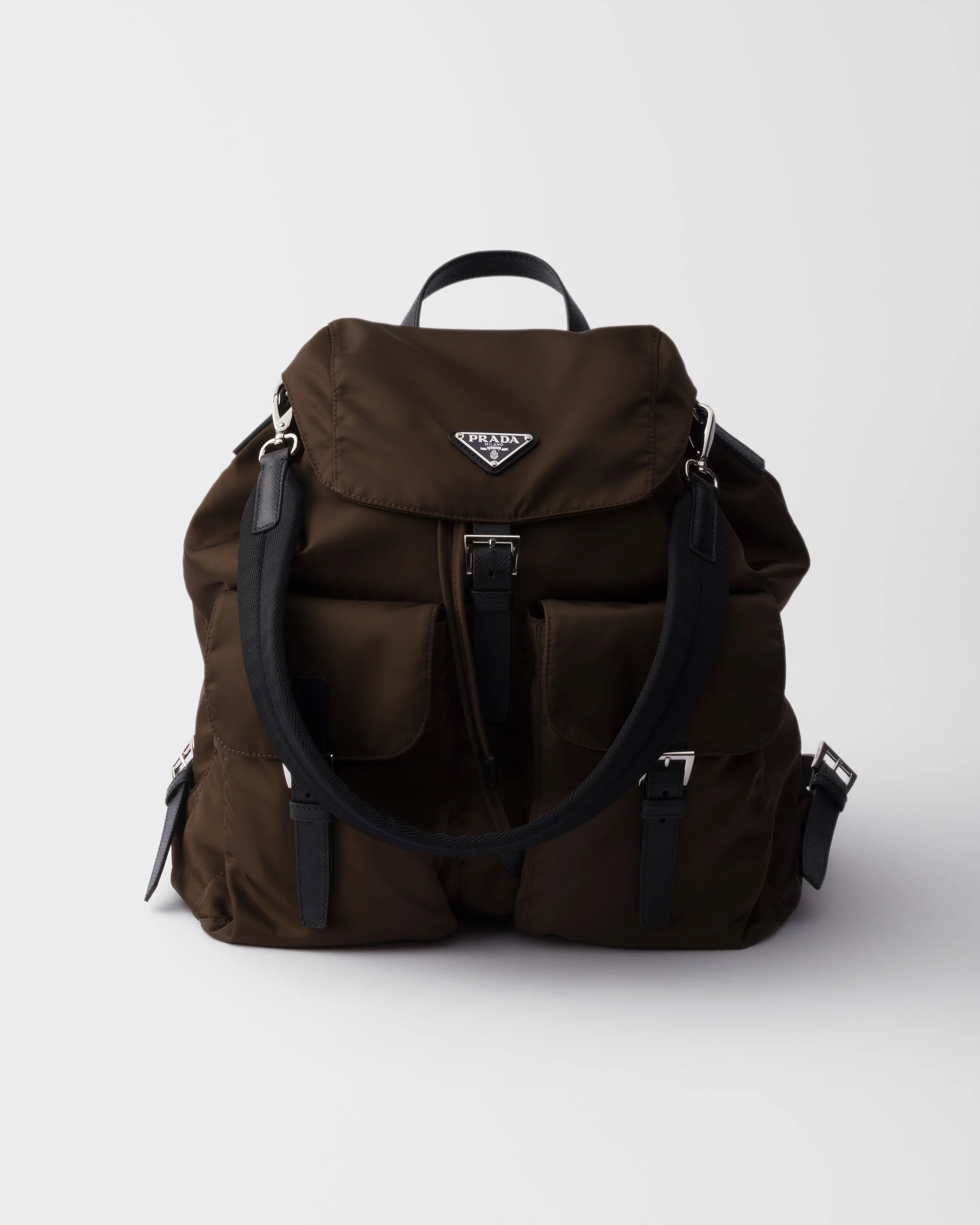 Minimalist, functional, and innovative, the Re-Nylon backpack sums up the codes of Prada's DNA with its unique and timeless design. Saffiano leather detailing and refined metal buckles add a refined character to the silhouette while preserving its functional and versatile spirit. - Product code: 2VZ110_2C26_F0038_V_MMO - With removable padded woven nylon tape handle - Flat leather handle - Adjustable woven nylon tape harness straps - Enameled metal triangle logo on the front - Closure with flap, strap, buckle and magnet - two external pockets - Interior with zipper pocket and patch pocket - Logo-print Re-Nylon lining - Imported Height: 39cm Width: 34cm Length: 15cm MATERIALS Main material: Recycled polyamide