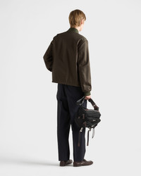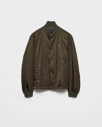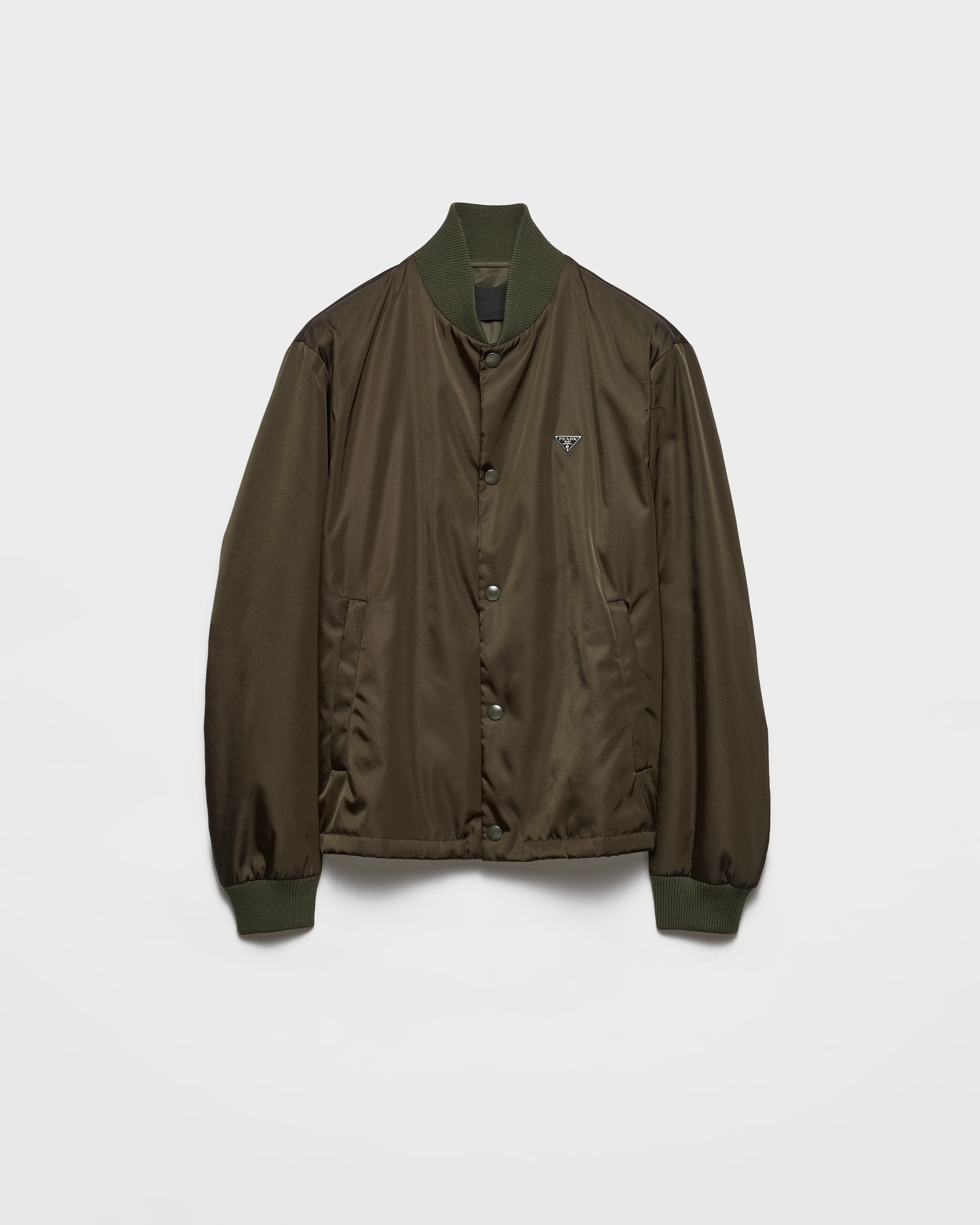 Re-Nylon expresses the dualities of the Prada aesthetic with its innovative, technical character and sophisticated finish. This bomber jacket combines the sporty functionality of regenerated nylon with the contemporary minimalism of the silhouette completed with ribbed knit details and decorated with the iconic triangle logo. - Product code: SGD132_1WQ8_F0Z58_S_OOO - Regular fit - Ribbed knit collar - Straight sleeves - Snap closure - Welt zipper pockets - Ribbed knit cuff - Wide shoulder - Elasticized drawstring - Lined and padded - Enameled metal triangle logo on the front--The fabric is made of regenerated yarn obtained from recycled plastic materials collected in the ocean. - Imported - The model is 188 cm tall and wears a size 48 Height: 65cm MATERIALS Main material: 100% Recycled Polyamide