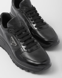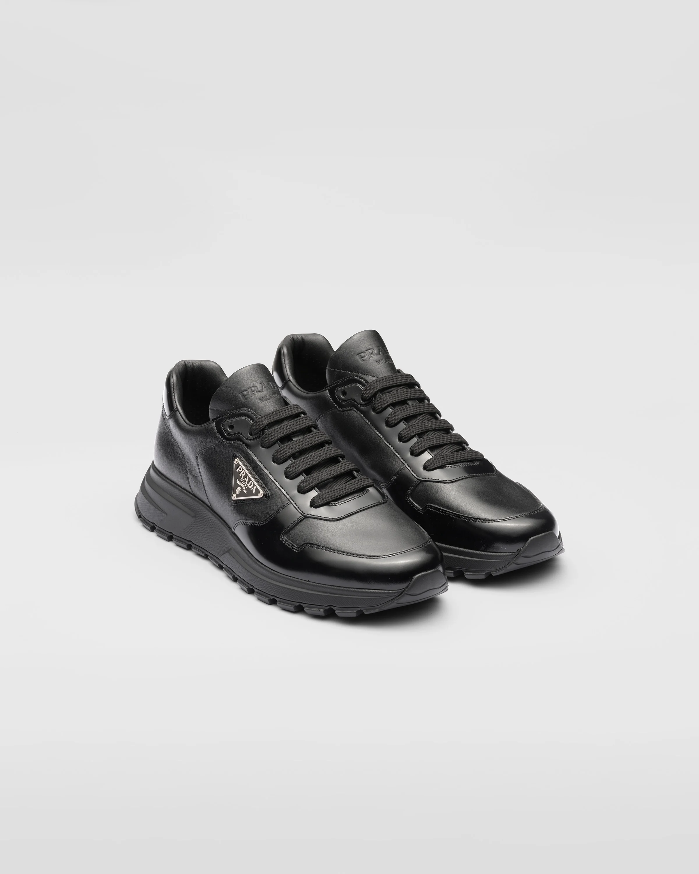 These sneakers combine an elegant yet innovative design. The leather shoe is decorated with the enameled metal triangle logo. A chunky outsole with rubber lug tread completes the silhouette with hybrid allure. - Product code: 2EE369_3LKI_F0002_F_G000 - With laces - Upper with perforated lining - Enameled metal triangle logo applied on the upper - Prada Milano screen-printed logo on the tongue - Rubber sole with square lugs - 40 mm sole height - Removable leather-covered insole - Imported MATERIALS Main material: Calfskin
