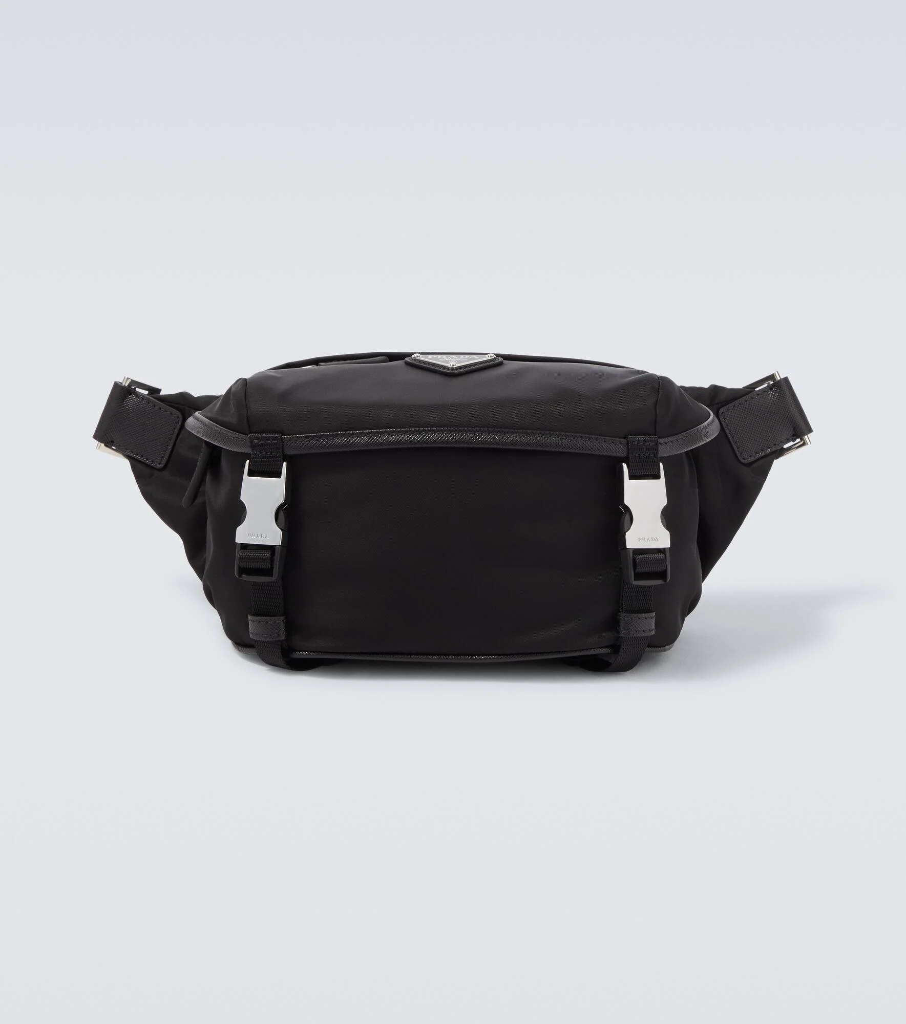 This Re-Nylon belt bag features Saffiano leather trims, logo hardware, and buckle closures. Offering a more sustainable take on a signature fabric, Prada’s Re-Nylon products are made from regenerated ocean plastic waste. Product Details - Material: polyamide (recycled) - Lining: fabric - Made in Italy - Designer color name: Black - Item color: black - Trim: leather - Hardware color: silver - Adjustable shoulder strap - Closure: push-clasp fastening - Zipped front pocket - Zipped back pocket - Item number: P01133606