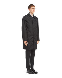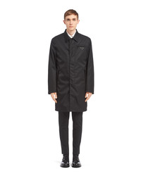 Technologically innovative fabrics take on couture treatments and volumes in a garment that celebrates contradiction, an expression of the quintessence of Prada. This raincoat with clean, refined lines is made of Re-Nylon, an innovative fabric produced from recycled, purified plastic materials collected in the ocean, fishing nets, and textile fibers. For sustainable care to preserve the product's characteristics and reduce microfiber shedding, we recommend not washing the item too often. Let the product air out after every use and have it dry cleaned at a specialized ecological dry cleaners. - Product code: SGB008_1WQ8_F0002_S_191 - Regular fit - Shirt collar - Straight sleeve - Zipper closure and buttons - Welt zipper pockets - Straight cuff - Regular shoulder - Straight hem - Partially lined - Enameled metal triangle logo - Imported Height: 95cm MATERIALS Main material: 100% recycled polyamide