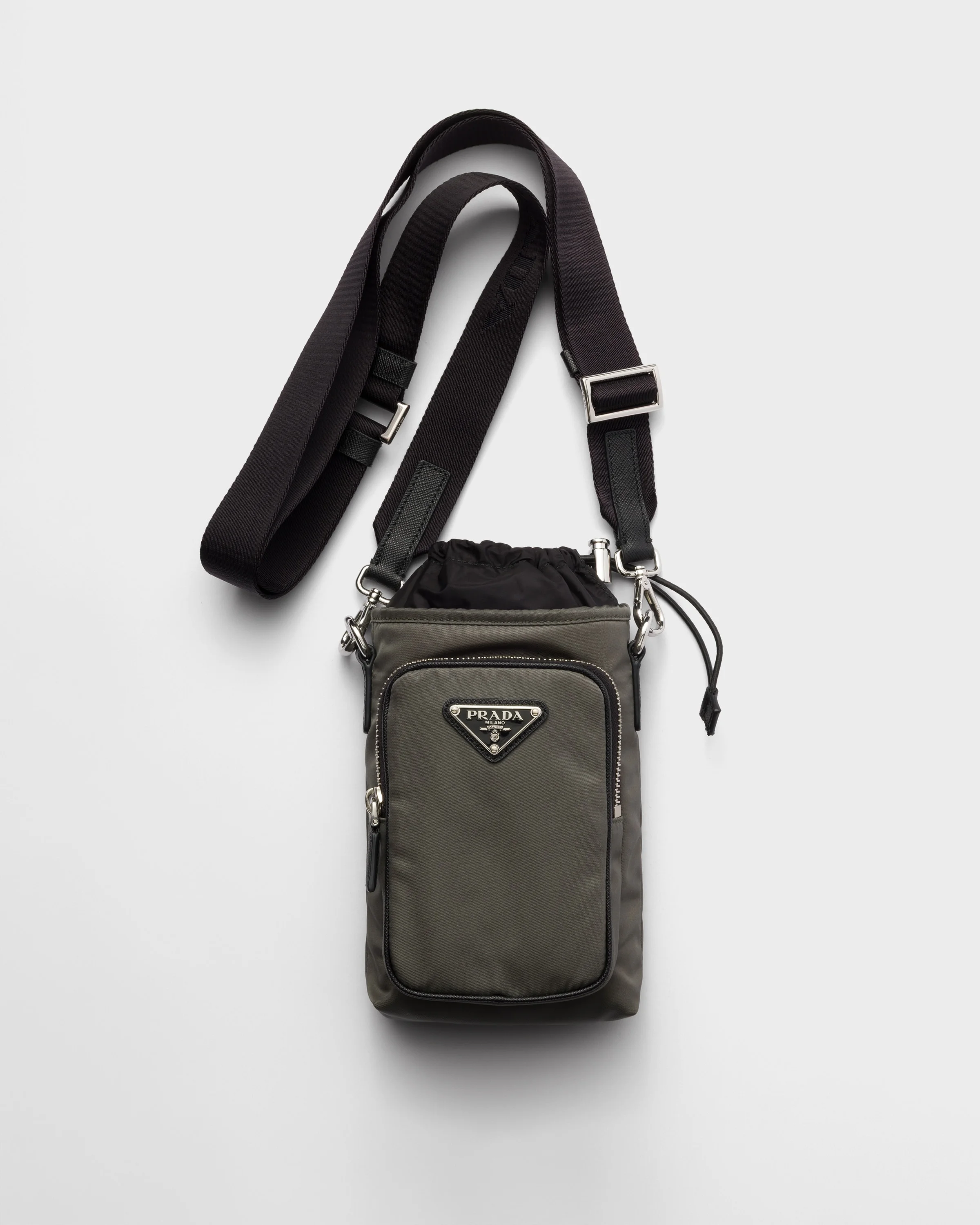 This smartphone case made of innovative Re-Nylon expresses a modern, urban character. The accessory is distinguished by the adjustable woven nylon tape shoulder strap and drawstring closure. The front is decorated with the iconic enameled metal triangle logo. For sustainable care to preserve the product's characteristics and reduce microfiber shedding, we recommend not washing the item too often. Let the product air out after every use and have it dry cleaned at a specialized ecological dry cleaners. - Product code: 2ZH155_2DMI_F0414 - Drawstring closure - Enameled metal triangle logo - Detachable adjustable woven nylon tape shoulder strap - Imported Height: 18cm Width: 13cm MATERIALS Main material: Recycled polyamide