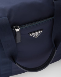 The new collection Prada combines traditional materials and technologically innovative recycled fibers, creating hybrid designs that blend old and new, luxury and simplicity, like this large duffle bag in a solid color made of Re-Nylon Gabardine fabric and Saffiano leather. A functional material and vehicle of experimentation, Re-Nylon is a regenerated nylon yarn produced from recycled and purified plastic trash recovered in the oceans, fishing nets, and textile fiber waste. It is combined in this duffle bag with Saffiano leather, calf leather of the highest quality defined by a crosshatch texture and wax finish. The bag, with the metal triangle logo, comes with a name tag. For sustainable care to preserve the product's characteristics and reduce microfiber shedding, we recommend not washing the item too often. Let the product air out after every use and have it dry cleaned at a specialized ecological dry cleaners. - Product code: 2VC796_2DMH_F0008_V_OOO - Woven nylon tape handles - Enameled metal triangle logo on the front - Zipper closure and small lock - Removable leather name tag - One external zipper pocket - Internal zipper pocket - Re-Nylon logo print lining - Imported Height: 40cm Width: 44.5cm Length: 24cm MATERIALS Main material: Recycled Polyamide