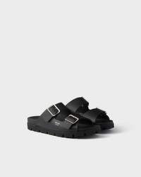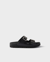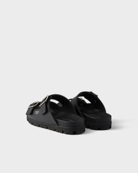 These rubber sandals with a casual and functional design are characterized by their comfortable strap silhouette with metal buckles. Sporty soles complete the sandal decorated with the screen-printed lettering logo. - Product code: 2X3159_3LKK_F0002_F_G000 - Straps with metal buckles - Prada Milano logo screen-printed and hot-stamped on the upper - Rubber lug sole - Heel height: 25 mm - Leather-covered insole - Imported MATERIALS Main material: Ethyl vinyl acetate - EVA