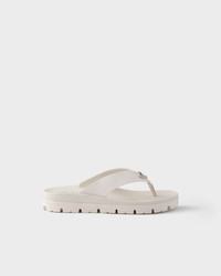 These rubber thong sandals have a contemporary silhouette with sleek details. The style, enriched by the iconic enameled metal triangle logo, is characterized by a rubber sole with lug tread that adds a sporty touch. - Product code: 2Y3130_3LKK_F0437_F_G001 - Enameled metal triangle logo applied on the upper - Rubber sole with lug tread - Heel height 025 mm - Leather-covered insole - Imported MATERIALS Main material: Calfskin