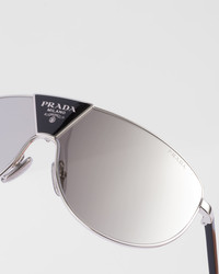 Sunglasses with teardrop shape given a contemporary twist. The metal frame defines the curved, rounded lenses while the iconic Prada logo stands out at the center of the bridge, highlighted by the contrasting color. - Product code: SPR69Z_E1BC_F02B0_C_037 - Metal frame front in Silver - Frame not compatible with graduated lenses - 100% UVA / UVB protection - Adjustable nose pads suitable for any fit - Lens-nose-temple measurement: 37-130 mm - Article comes with dedicated packaging - Imported - The model is 186 cm tall and wears a size 48