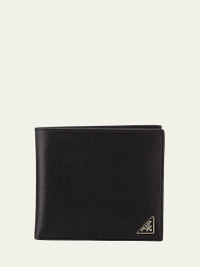 Prada saffiano leather wallet. Bifold style; logo plate at corner. Inside, eight card slots; bill slip. Made in Italy.