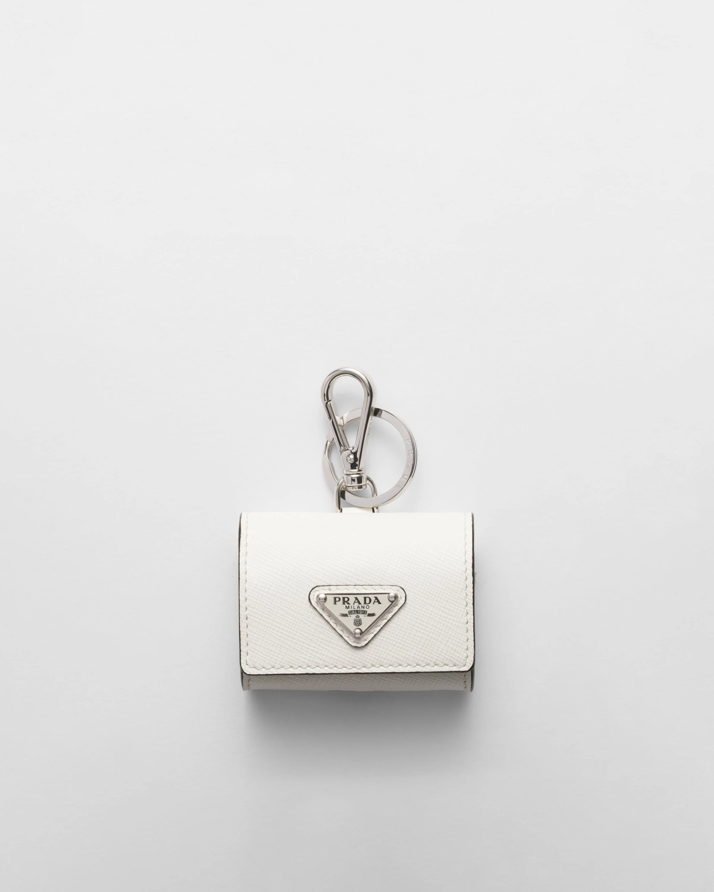 Made of Saffiano leather, a brand hallmark, this headphone case is defined by the enamel triangle logo on the front. The accessory has a metal snap-hook and ring. - Product code: 2TT133_2AHF_F0009 - Saffiano leather - Flap closure with snap - Enamel triangle logo on the front - Metal snap-hook with ring - Imported Height: 6cm Width: 7.5cm MATERIALS Main material: Calfskin
