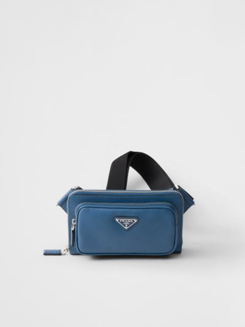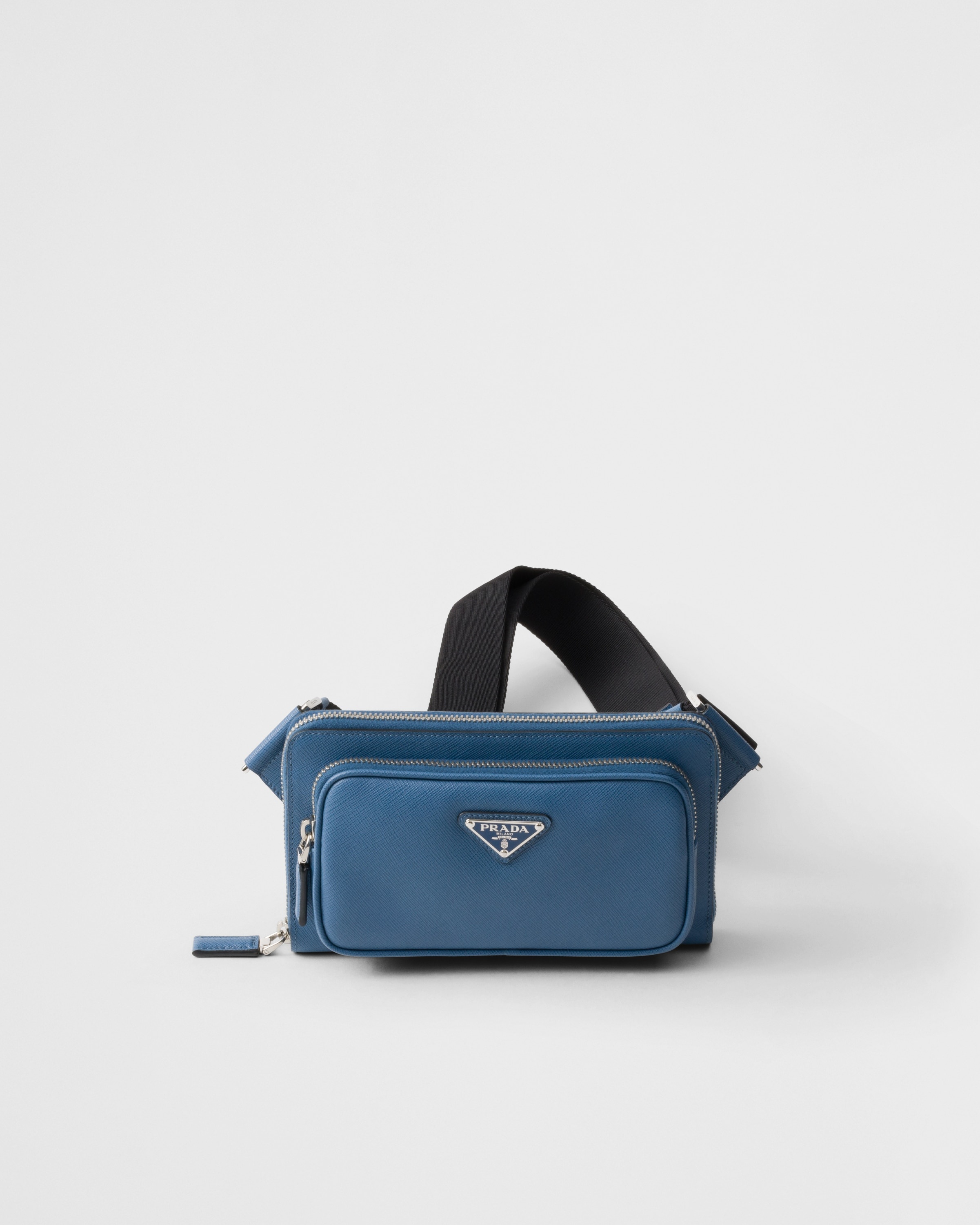 The hybrid concept that pervades the Prada narrative is reflected in this belt bag with modern allure. Sleek, elegant lines combined with fine Saffiano leather create a dialog with details from technical sports world, enriching the design of the accessory with new aesthetic visions. The iconic enameled metal triangle logo decorates the bag on the front. - 商品货号: 2VH156_9Z2_F03X2_V_OOO - Adjustable woven nylon tape shoulder strap and side-release buckle - Enameled metal triangle logo on the front - Zipper closure - External zipper pocket - Small back pocket - Card slots inside - Leather lining - 产品标签信息 高度: 13cm 宽度: 21cm MATERIALS Leather