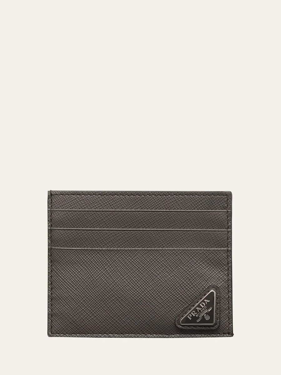 Prada card case in textured calf leather and fabric Features iconic triangle logo at front Six card slots; one central compartment Tonal stitching Made in Italy