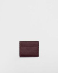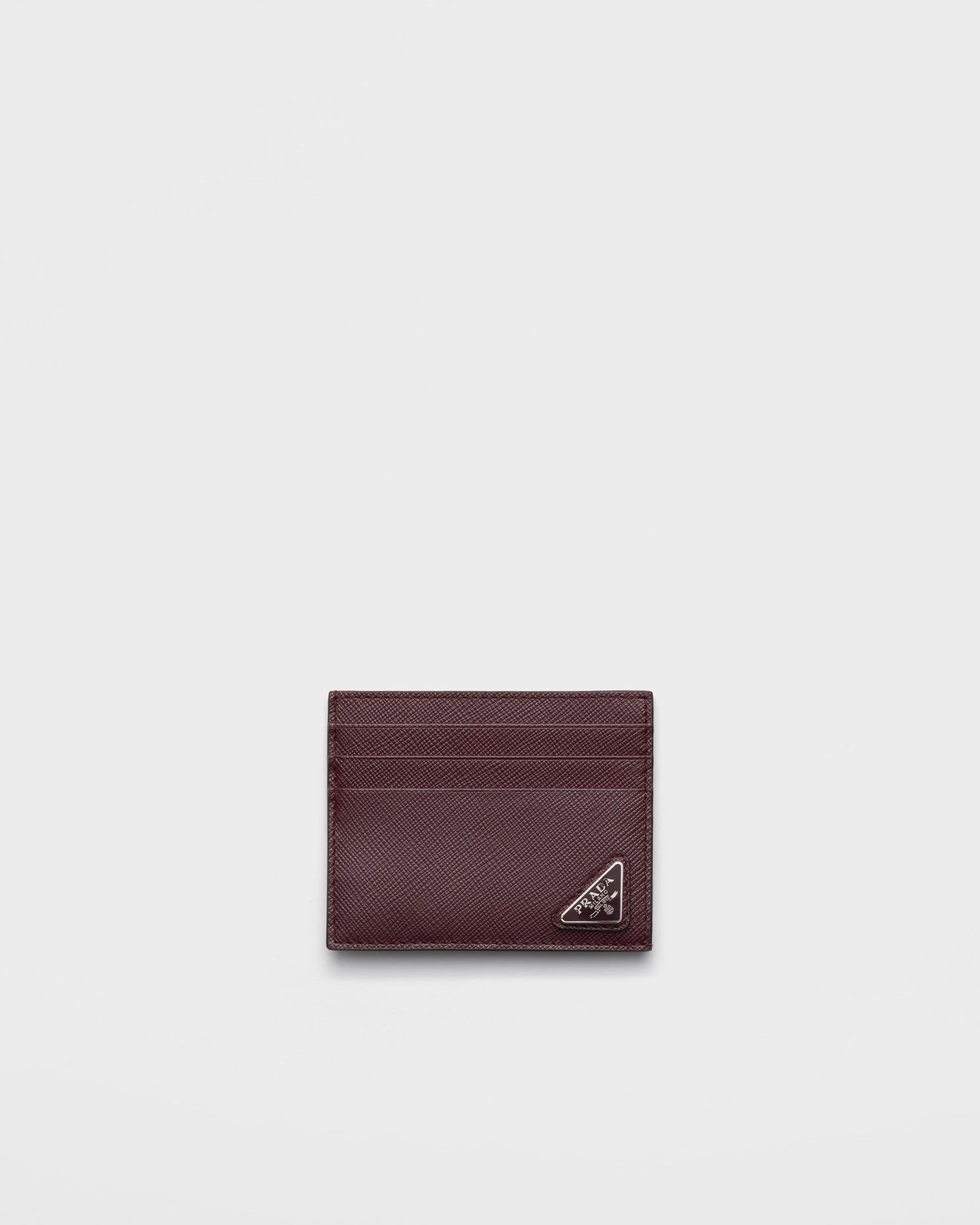 A Saffiano leather credit card holder with slots for six cards. It also has a center pocket, fabric lining and is set off by the Prada triangle logo in enamel on the bottom corner. - Product code: 2MC223_QHH_F0007 - Enameled metal triangle logo - Six card slots - One inside pocket - Moire and Saffiano leather lining - Imported Height: 8cm Width: 10cm MATERIALS Main material: Calfskin