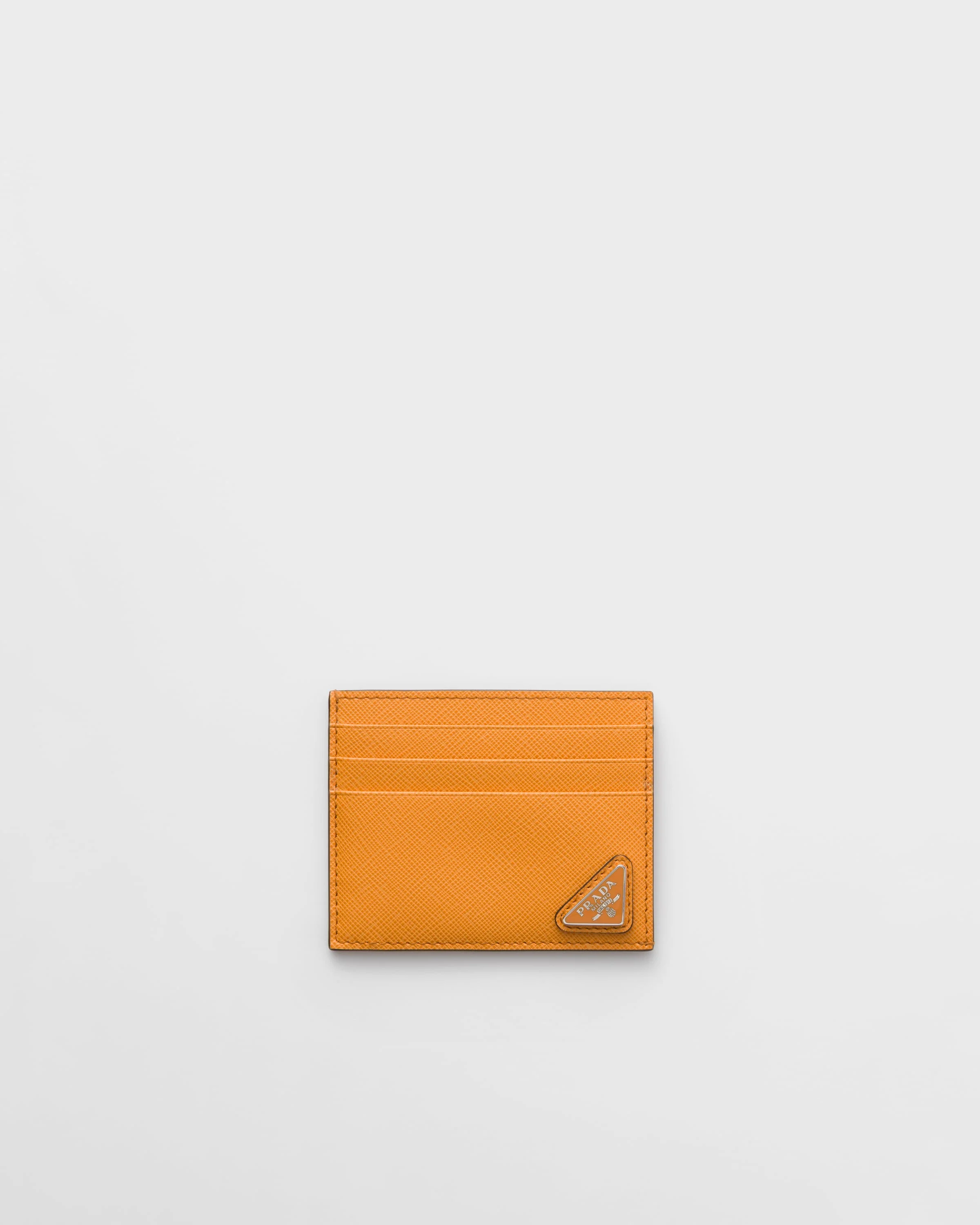 A Saffiano leather credit card holder with slots for six cards. It also has a center pocket, fabric lining and is set off by the Prada triangle logo in enamel on the bottom corner. - Product code: 2MC223_QHH_F0287 - Enameled metal triangle logo - Six card slots - One inside pocket - Moire and Saffiano leather lining - Imported Height: 8cm Width: 10cm MATERIALS Main material: Calfskin