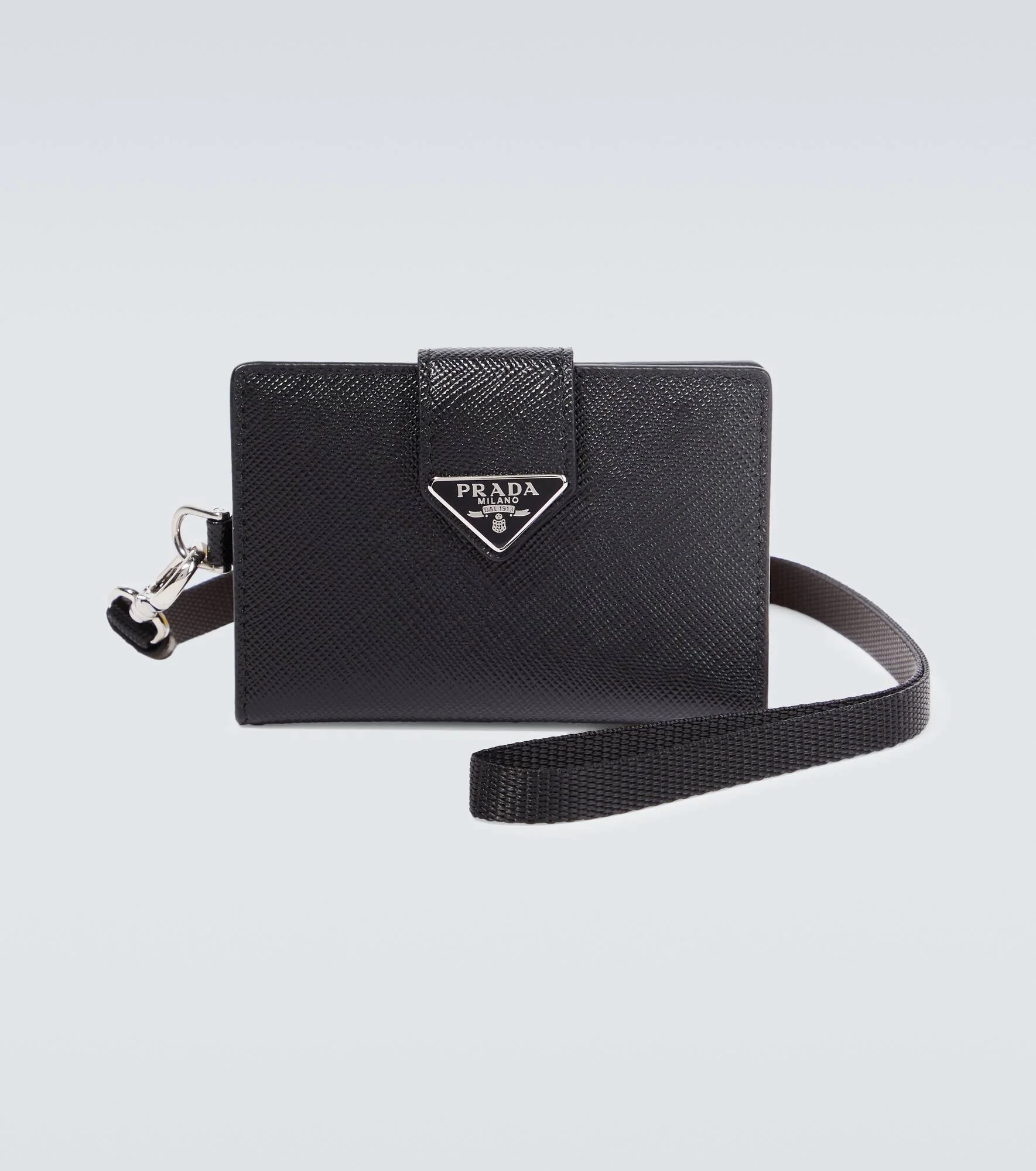 With a signature Saffiano grained leather finish, this Prada cardholder features multiple card slots, and the label’s logo accents the snap button closure in silver-toned enamel. Product Details - Comes with dust bag - Comes with a box - Material: leather - Color of fastening: silver - Closure: snap-buttoned fastening - Internal details: card slot, leather lining - Made in Italy - Item number: P00758795 Size & Fit - Height 10cm-4" - Width 7cm-3" - Depth 1cm-0.5" - Length of wrist strap 43cm-17"