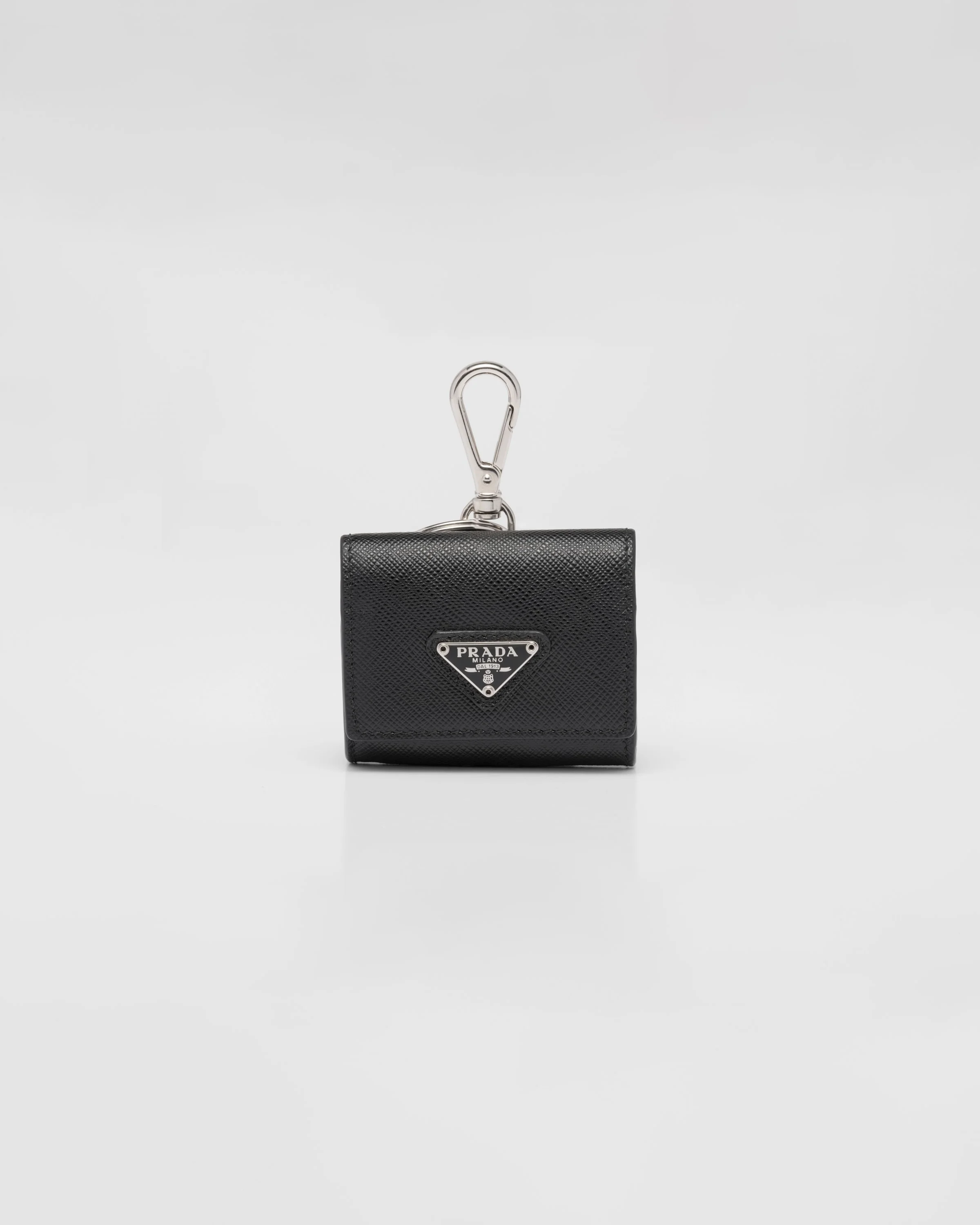 Made of Saffiano leather, a brand hallmark, this headphone case is defined by the enamel triangle logo on the front. The accessory has a metal snap-hook and ring. - Product code: 2TT133_2AHF_F0002 - Saffiano leather - Flap closure with snap - Enamel triangle logo on the front - Metal snap-hook with ring - Imported Height: 6cm Width: 7.5cm MATERIALS Main material: Calfskin