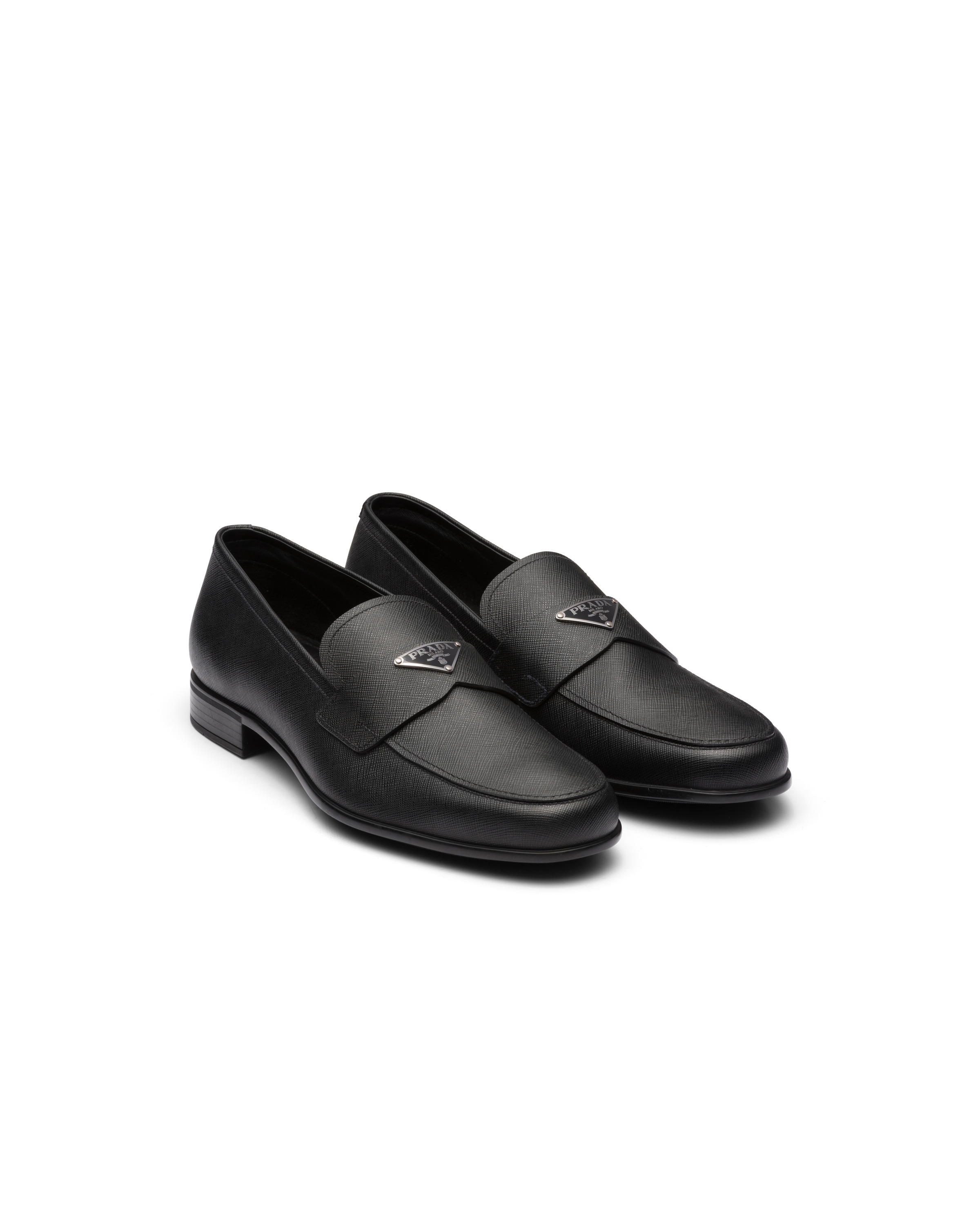 These loafers made of iconic Saffiano leather are characterized by the triangle logo on the saddle strap. - Product code: 2DB180_053_F0002_F_G001 - Upper: Saffiano leather - Enameled metal triangle logo - Rubber sole - Imported MATERIALS Leather