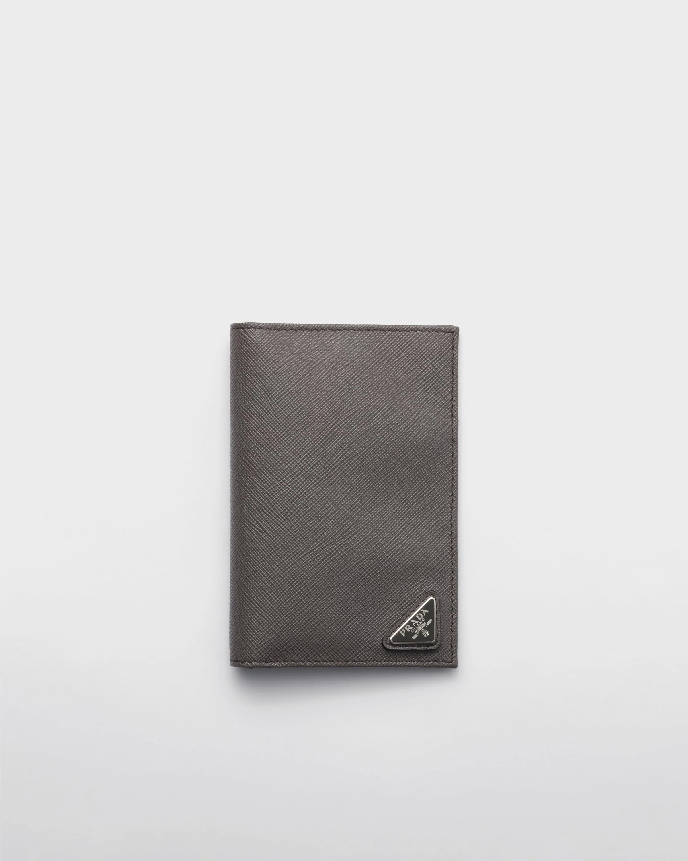 The triangle logo first introduced on trunks designed by Mario Prada decorates this passport holder, an accessory that blends modernity and tradition. Saffiano leather, an iconic Prada material with a crosshatch pattern and wax finish, is synonymous with luxury and identifies with traditional Italian leather goods production. - Product code: 2MV017_QHH_F0170 - Enameled metal triangle logo - Three card slots - Three document pockets - Moire and Saffiano lining - Imported Height: 14cm Width: 9.5cm MATERIALS Main material: Calfskin