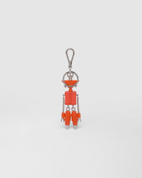This robot keychain made of metal and the brand's iconic Saffiano leather is accessorized with an eclectic mix of details and electric plugs. Provided with a steel-plated ring and snap-hook, the design is decorated with the enameled metal triangle logo. - Product code: 2TR102_2FOS_F0049 - Snap-hook and ring - Enameled metal triangle logo - Imported Height: 9.5cm MATERIALS Main material: Calfskin