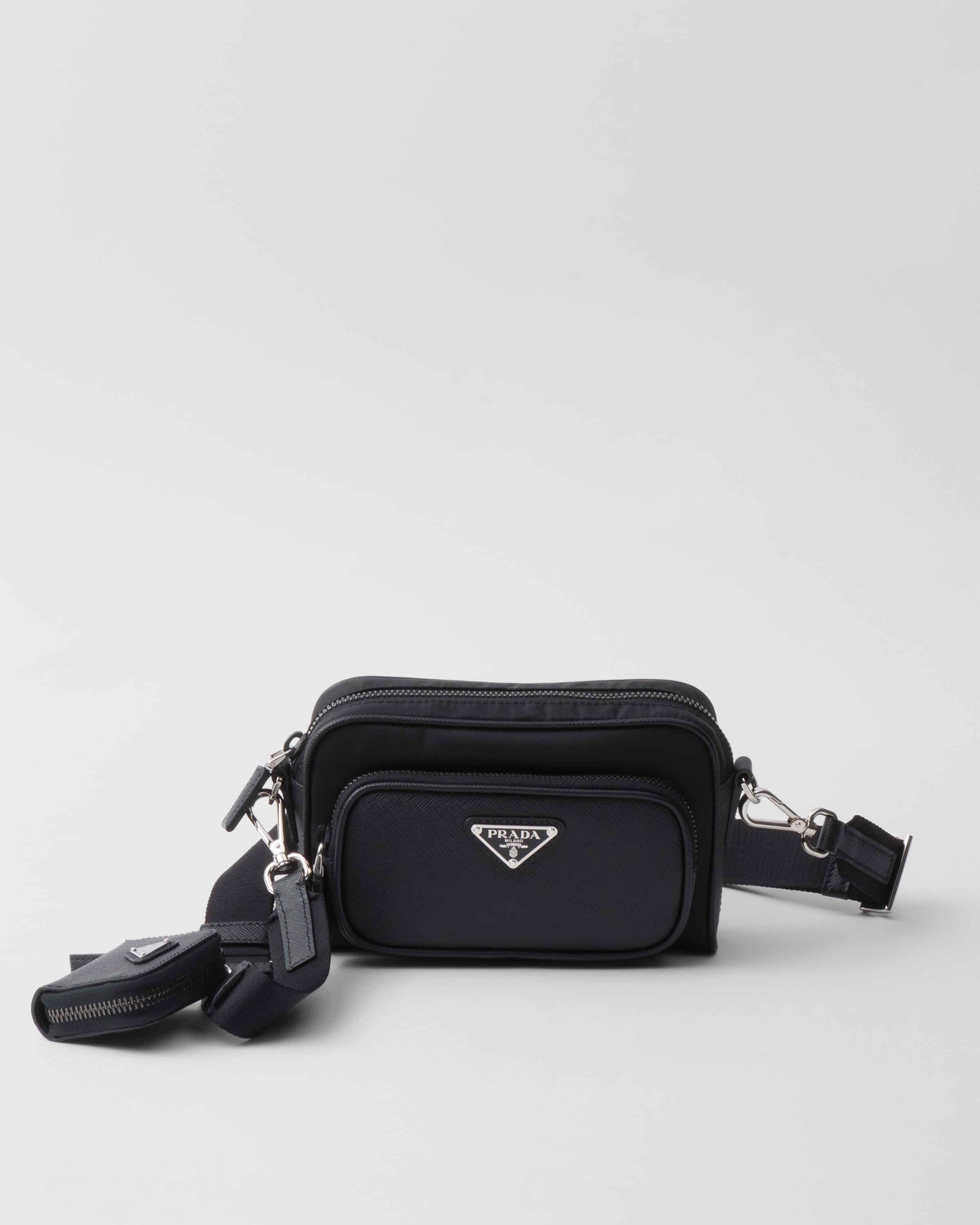This bag with a functional, sporty character has a hybrid design defined by the combination of two of Prada's iconic materials. The pragmatic touch ofinnovative Re-Nylon and the unmistakable crosshatch finish of Saffiano leather enrich the compact bag. The shoulder strap with removable pouch completes the accessory decorated with the emblematic enameled metal triangle logo. - Product code: 2VH172_2DMH_F0002_V_OOO - Adjustable and removable woven nylon tape and leather shoulder strap with removable pouch - Enameled metal triangle logo on the front - Zipper closure - One external zipper pocket - Interior with patch pocket - Logo-print Re-Nylon lining - Imported Height: 11.5cm Width: 18cm Length: 5cm MATERIALS Fabric/Leather