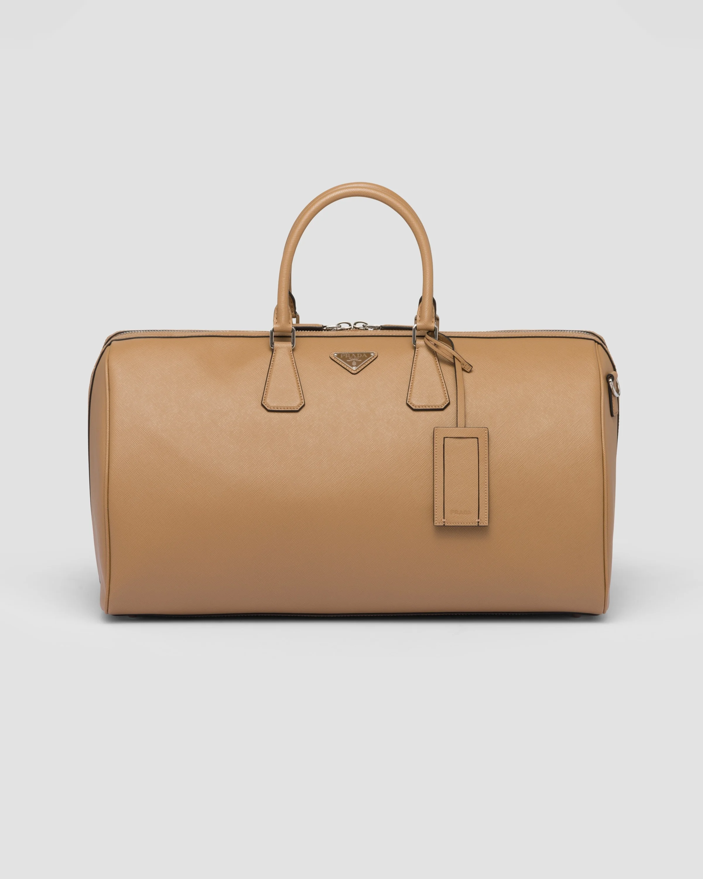 This elegant duffle bag in Saffiano leather with all-around zipper and nylon shoulder strap has rigorous design. The leather name tag and metal lock engraved with the lettering logo decorate this accessory. - Product code: 2VC018_9Z2_F03OF_V_OOO - Leather handles - Detachable adjustable woven nylon shoulder strap - Enameled metal triangle logo on the front - Zipper closure - Removable leather name tag - Interior with two zipped pockets - Prada logo nylon lining - Small metal feet - Imported Height: 27.5cm Width: 50cm Length: 25cm MATERIALS Main material: Calfskin