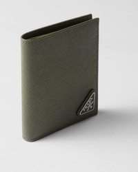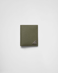 This elegant Saffiano leather wallet is decorated with the enamel triangle logo. It has two pockets, one bill compartment and eight card slots inside. - Product code: 2MO004_QHH_F0466 - Enameled metal triangle logo - Eight card slots - One bill compartment - Moire and Saffiano leather lining - Imported Height: 10cm Width: 9cm MATERIALS Main material: Calfskin