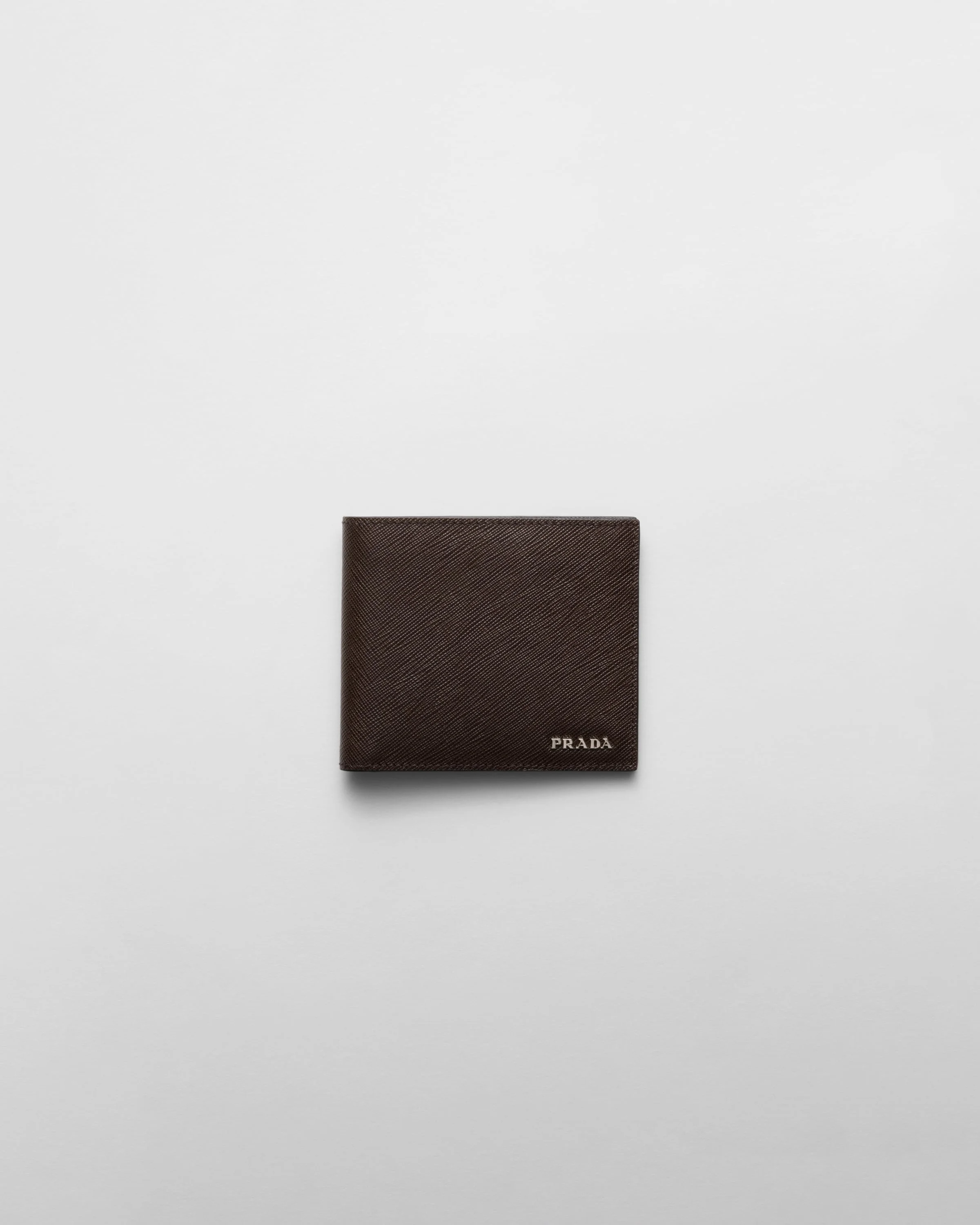 This wallet pairs the cross-hatch design of Saffiano leather with a Prada metal text logo on the front. It opens to eight credit card slots, and several compartments and pockets, fabric lined throughout. - Product code: 2MO513_2FPJ_F0LEX - Contrasting color interior - Metal lettering logo - Eight card slots - Two bill compartments - Moire and Saffiano leather lining - Imported Height: 9.5cm Width: 11cm MATERIALS Main material: Calfskin