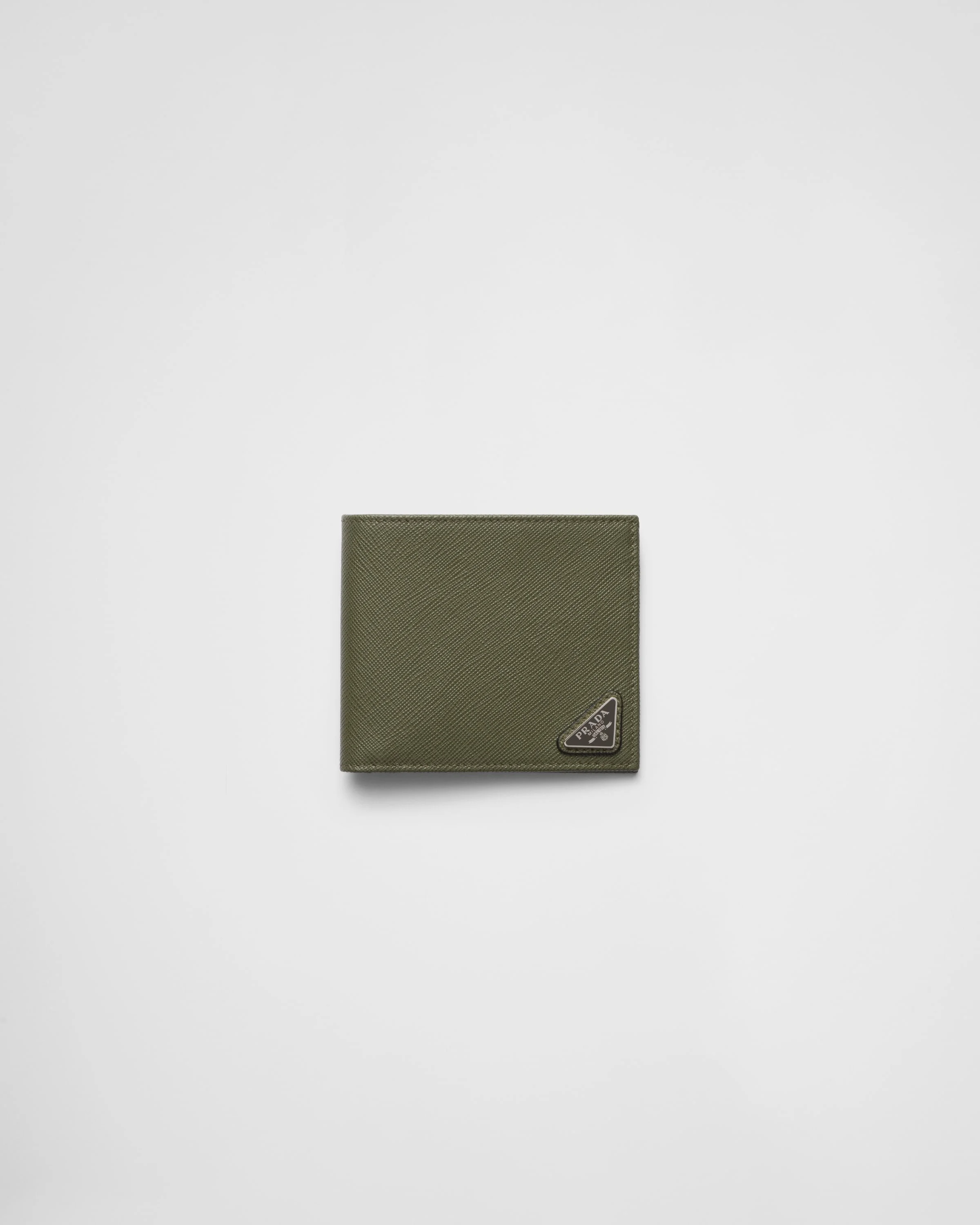This leather wallet pairs Saffiano leather with an enameled triangle corner logo. Its interior is fabric-lined, and it opens to eight credit card slots and several pockets and compartments. - Product code: 2MO513_QHH_F0466 - Enameled metal triangle logo - Eight card slots - Two bill compartments - Moire and Saffiano leather lining - Imported Height: 9.5cm Width: 11cm MATERIALS Main material: Calfskin