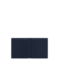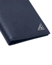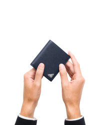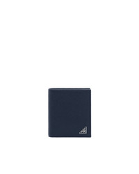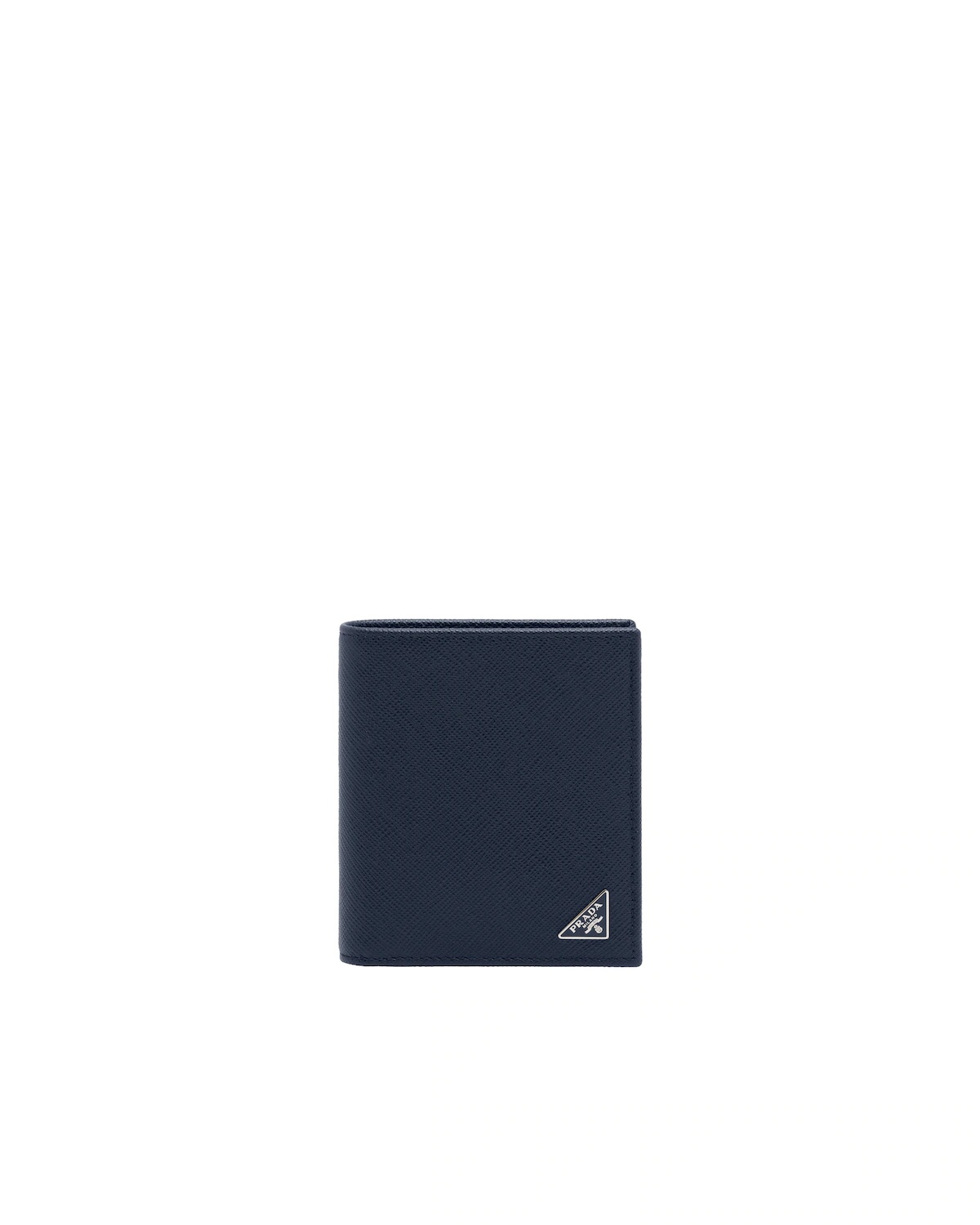 This elegant Saffiano leather wallet is decorated with the enamel triangle logo. It has two pockets, one bill compartment and eight card slots inside. - Product code: 2MO004_QHH_F0216 - Enameled metal triangle logo - Eight card slots - One bill compartment - Moire and Saffiano leather lining - Height: 10cm - Width: 9cm MATERIALS Leather